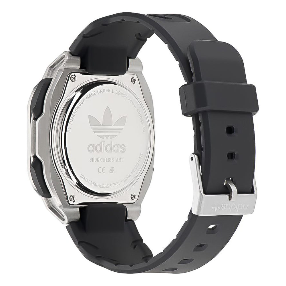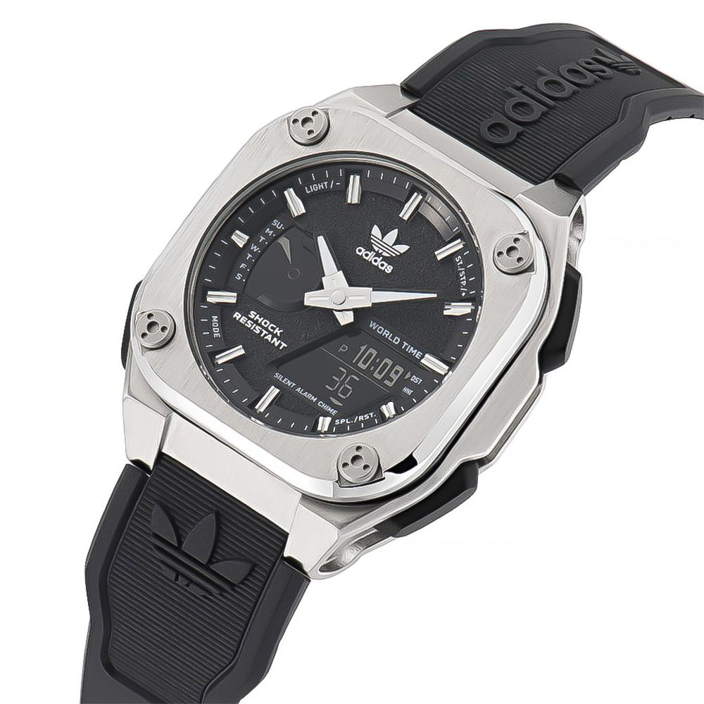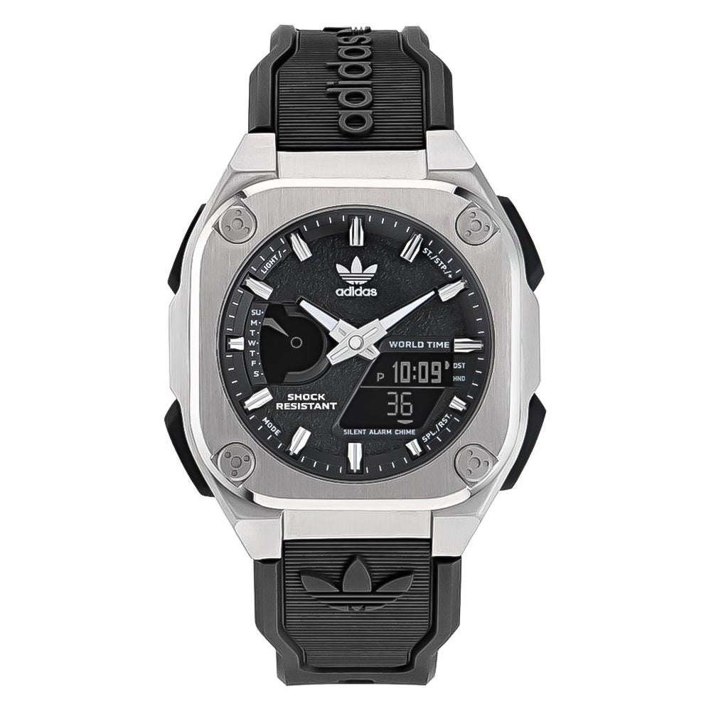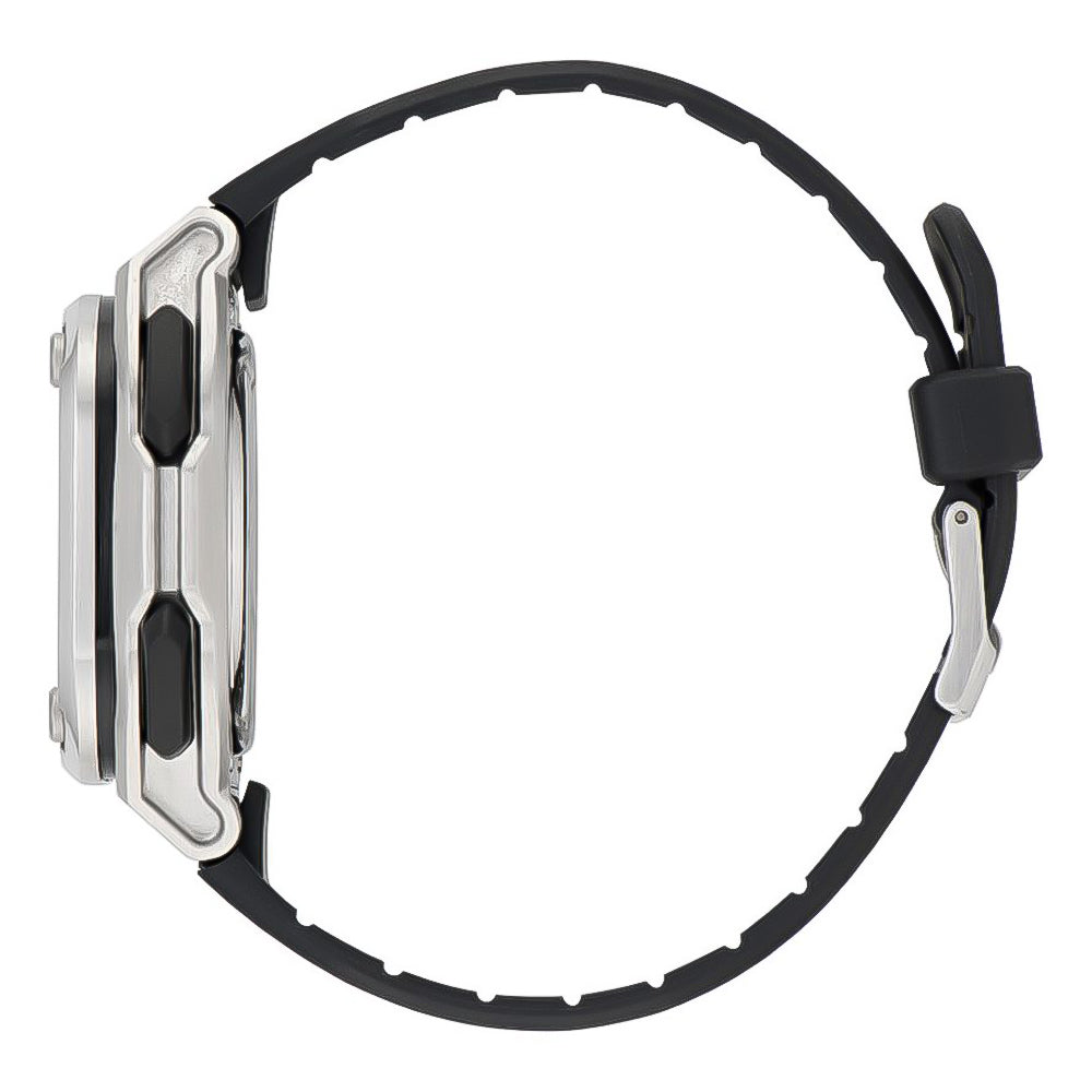 A versatile and trendy watch perfect for daily wear. Crafted from eco-friendly silver stainless steel, the case pairs elegantly with a sleek black resin strap. Shielded by sturdy hesalite glass, this watch boasts a range of functions including weekday date display, world time, alarm, stopwatch, and shock resistance.
