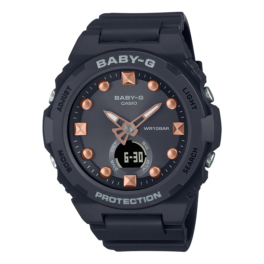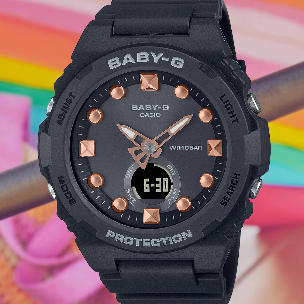 Soak in the sparkle and shine of the summer sun with a beach-inspired monochromatic BABY-G. The BGA-320, with its slim, oh-so-wearable case, features raised metallic index marks in a vapor deposition finish that shine like pearls and seashells ? treasures of the ocean.