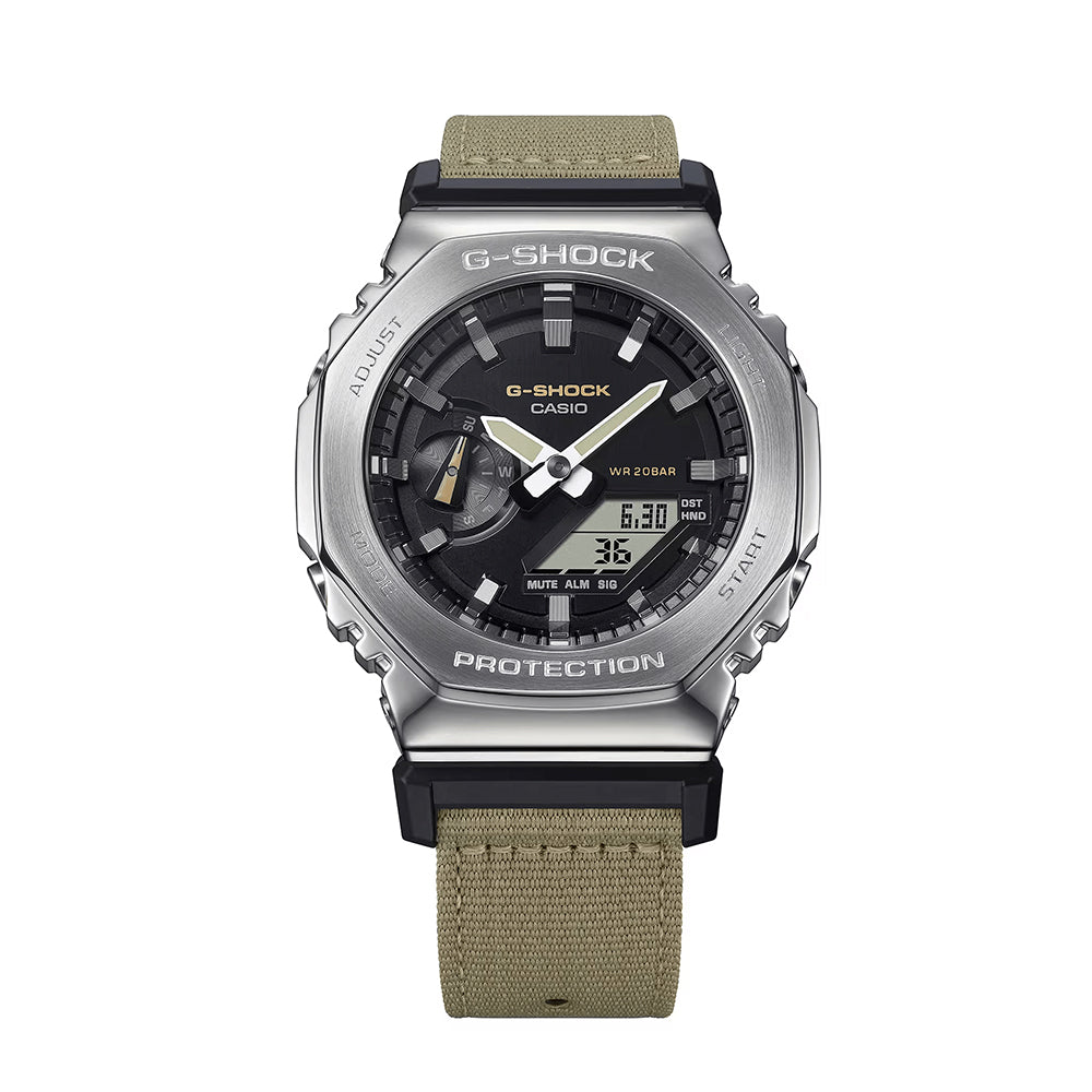 Add a utilitarian statement to your style with a G-SHOCK from the Utility Metal collection. These innovative watches take the iconic octagonal form and metal-clad design of the GM-2100 line and pair it with a casual fabric band in an utilitarian color that goes with any outfit.