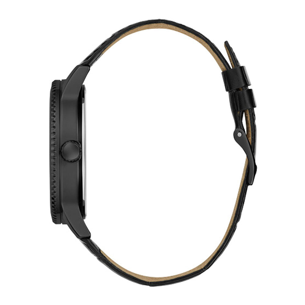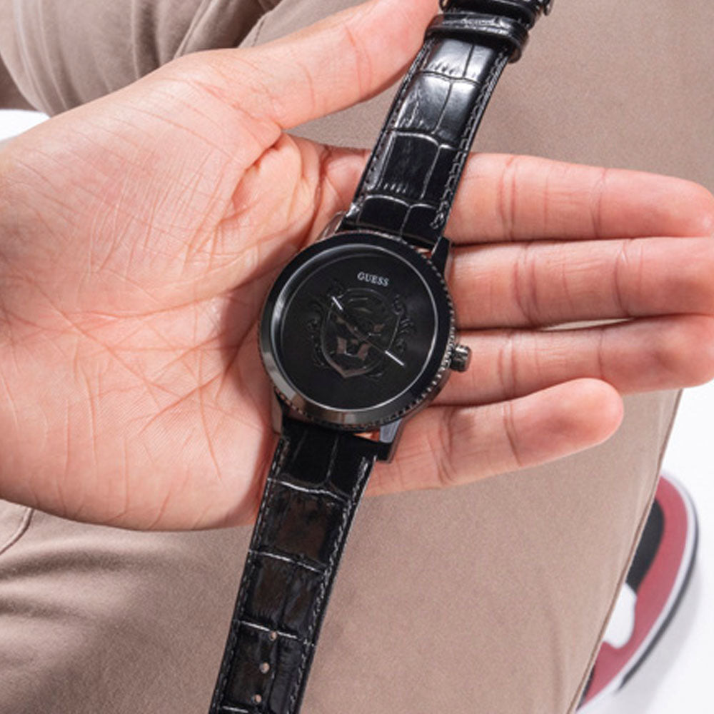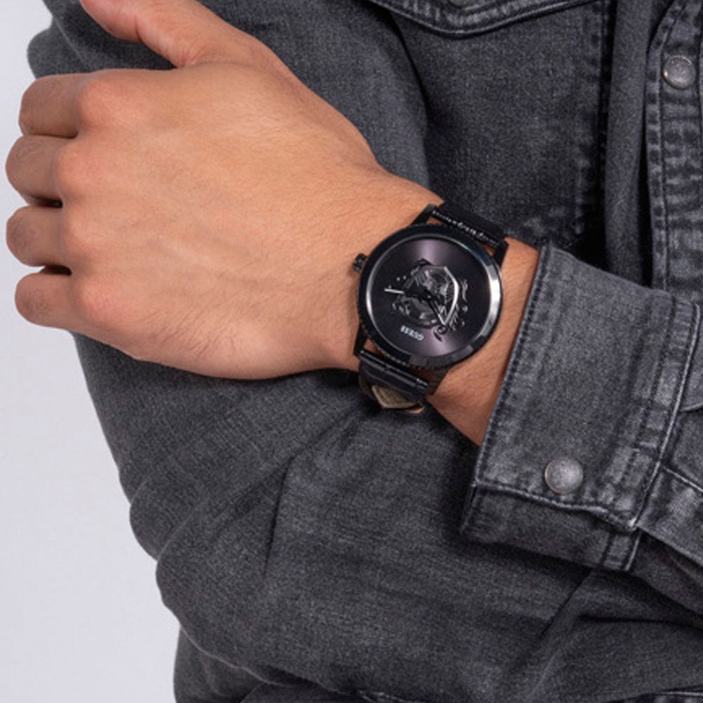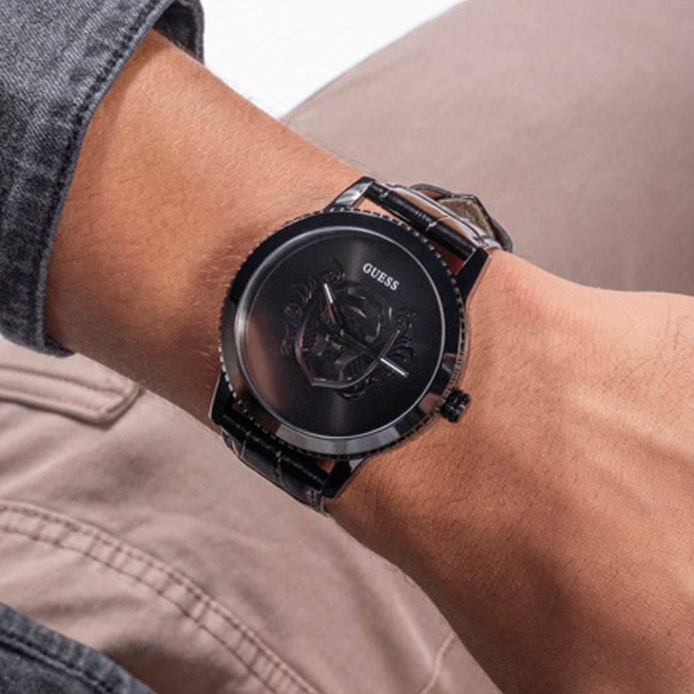 A fashionable timepiece for the gents with a steel case, a natural leather strap, and a black dial with stylish decoration.