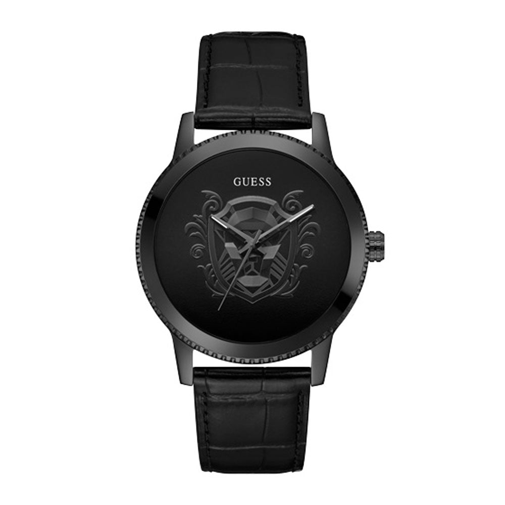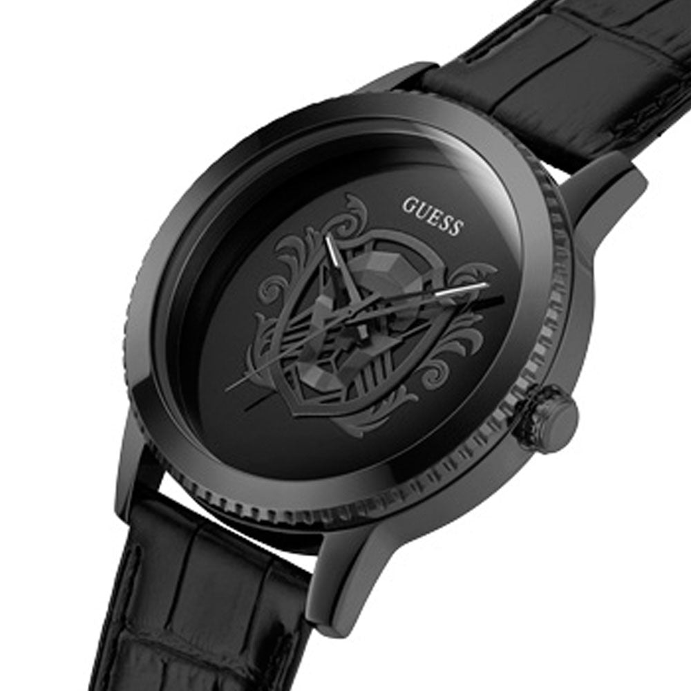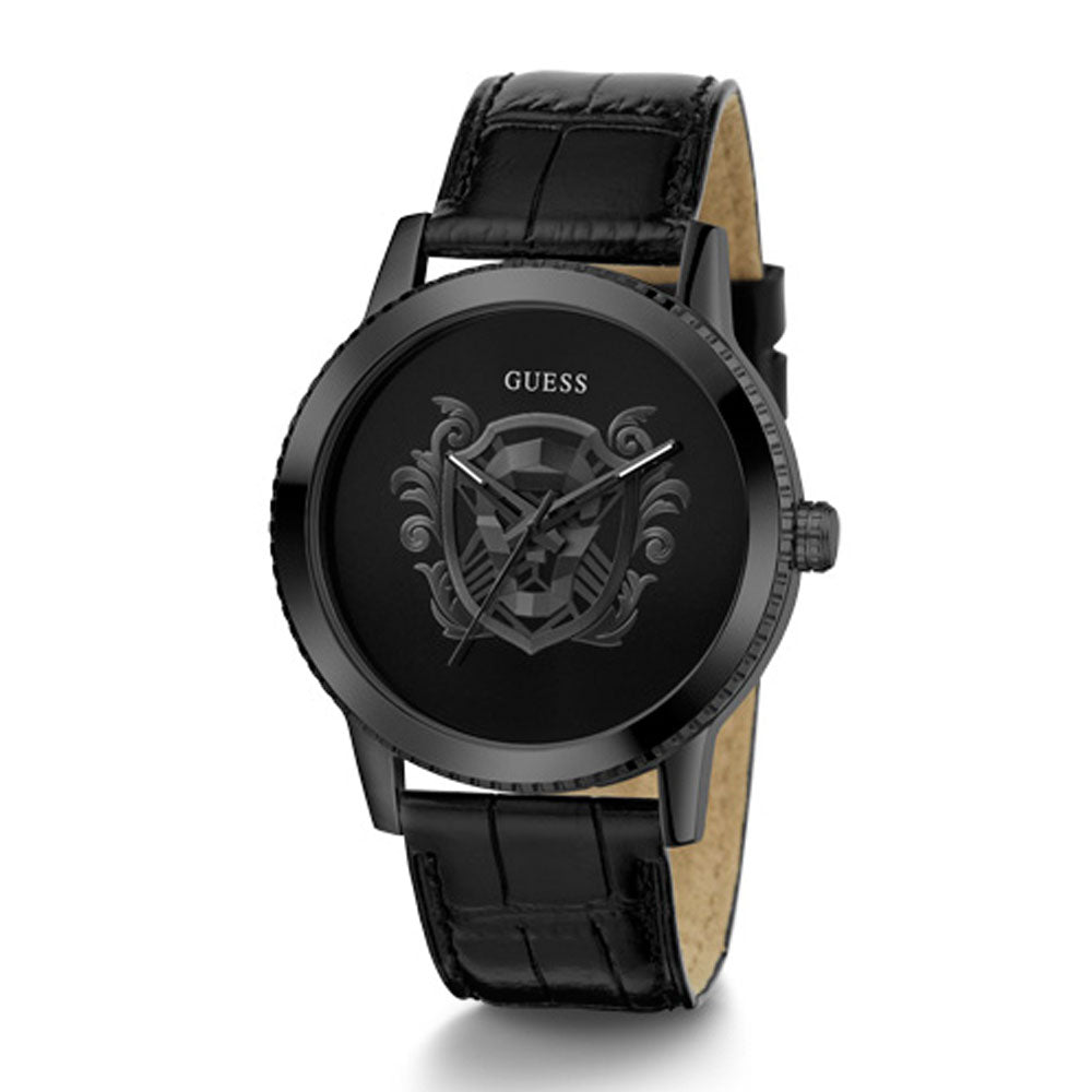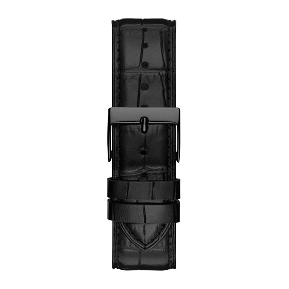 A fashionable timepiece for the gents with a steel case, a natural leather strap, and a black dial with stylish decoration.
