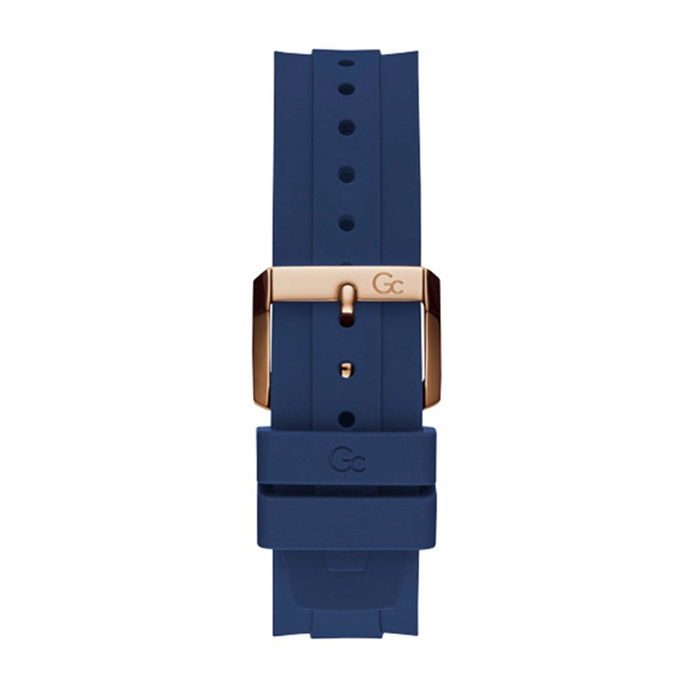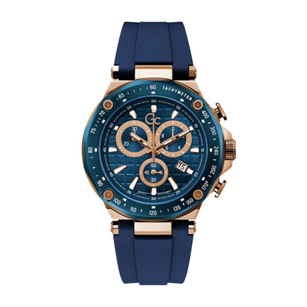 Embrace the Gc sports flair with this iconic two-tone rose gold and blue chronograph. This watch has a distinctively masculine silhouette thanks to a blue square pattern dial with rose gold accents, a blue PVD multi-faceted bezel, trademark screw design features, and a blue silicone strap.