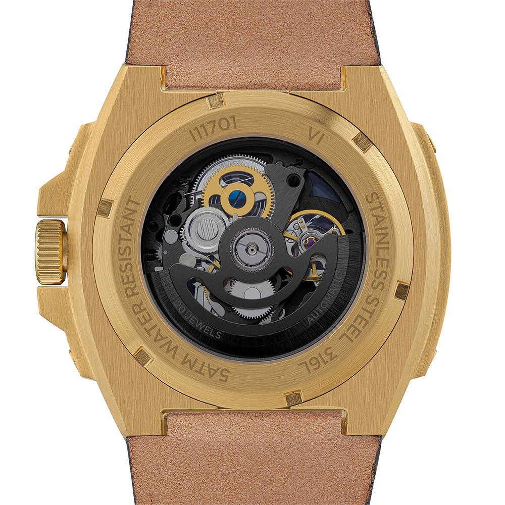 A contemporary and bold design. A luxury sports inspired watch typified by its purposeful construction and black exposed skeleton movement finished with contrasting hands and batons. An integrated custom Horween leather strap completes this unique timepiece.