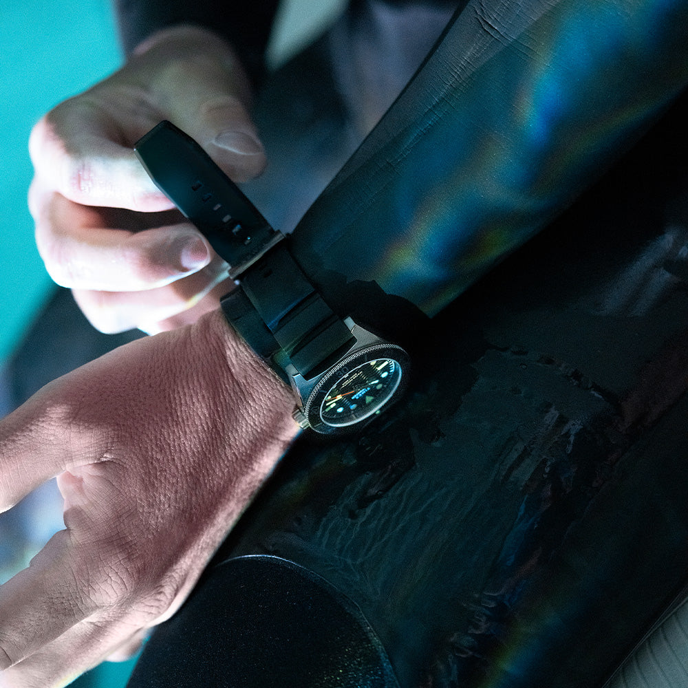Merging resilience and elegance with crucial functions for underwater pursuits, our Deepwater Reef 200 is expertly engineered to meet ISO standards. A sturdy 40mm stainless-steel case, fortified with a screw-down crown and screw-on caseback, effectively keeps water out and provides 200m of water resistance. This watch is powered by a reliable quartz movement, and we’ve equipped it with a scratch-resistant sapphire crystal with anti-reflective coating, a unidirectional bezel, and Super-Luminova® hands and hour markers providing the luminosity you rely on as you venture below. A unique wave pattern brings dimension to the dial, while the embossed rubber strap ensures durability and style both in and out of the water.