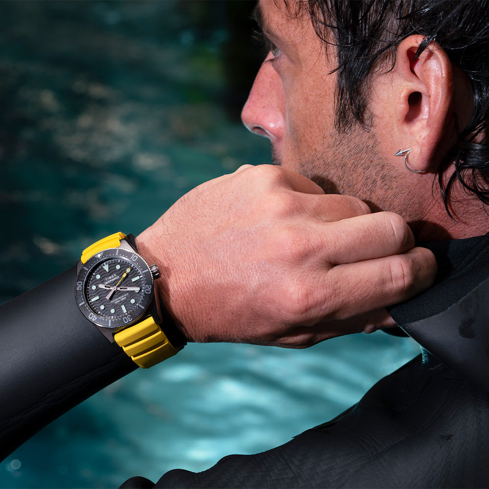 Merging resilience and elegance with crucial functions for underwater pursuits, our Deepwater Reef 200 is expertly engineered to meet ISO standards. A sturdy 40mm stainless-steel case, fortified with a screw-down crown and screw-on caseback, effectively keeps water out and provides 200m of water resistance. This watch is powered by a reliable quartz movement, and we’ve equipped it with a scratch-resistant sapphire crystal with anti-reflective coating, a unidirectional bezel, and Super-Luminova® hands and hour markers providing the luminosity you rely on as you venture below. A unique wave pattern brings dimension to the dial, while the embossed rubber strap ensures durability and style both in and out of the water.