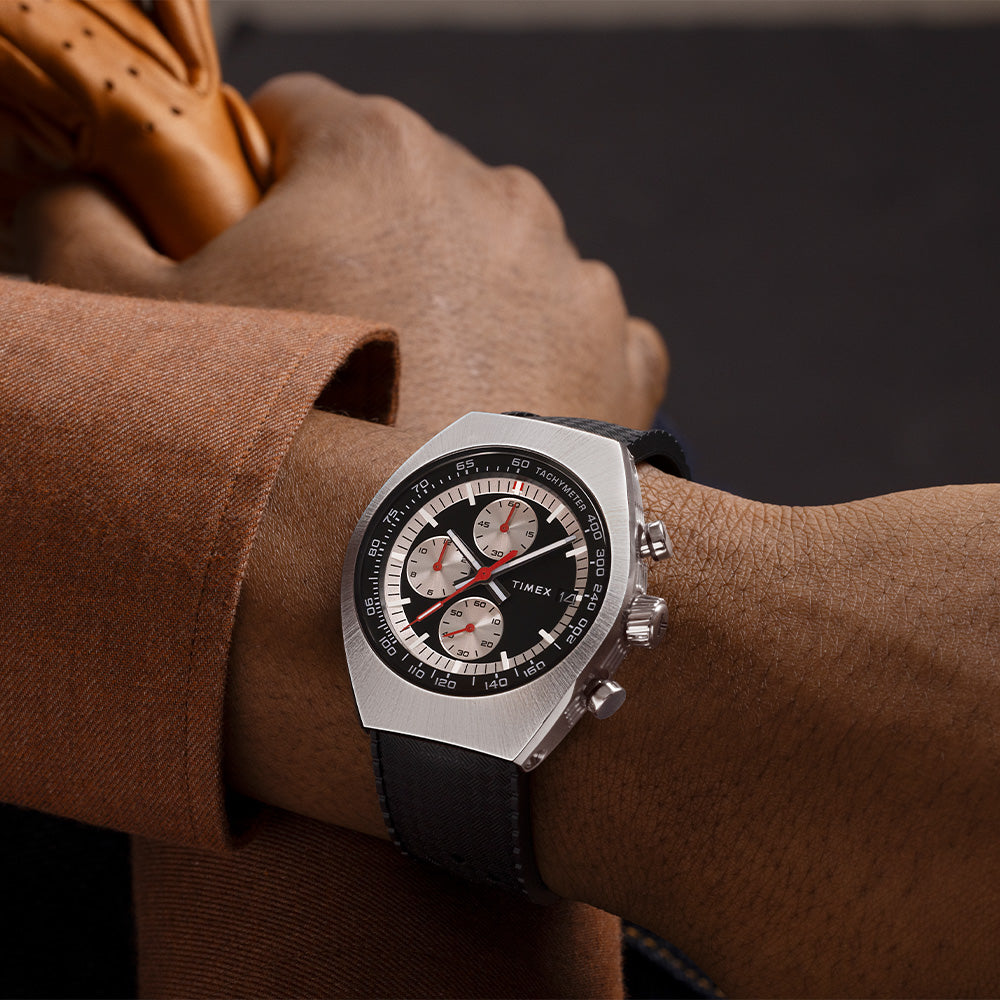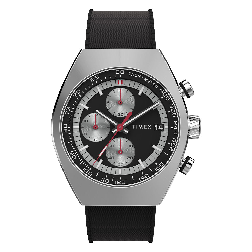 Designed to be visually striking, our Timex Legacy Tonneau Chronograph draws inspiration from the iconic watch styles of the ˜70s. Its sizable 42mm barrel-shaped stainless-steel case houses an elaborate, multi-layered dial with a date window beside the 3 o'clock mark. Sunburst brushing on the top of the case and intricate detailing on the case, crown, and pushers bring this polished timepiece even more sophistication, while bright red hands and a black synthetic rubber strap give it a sportier edge.