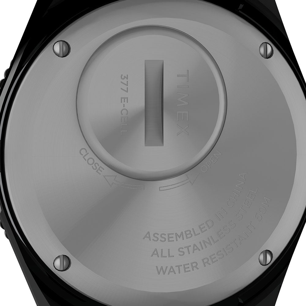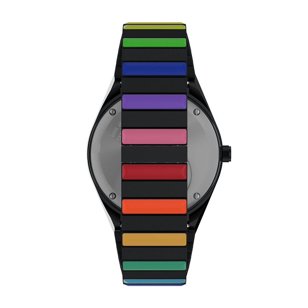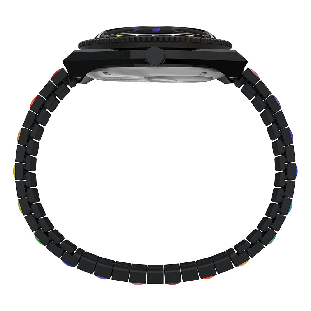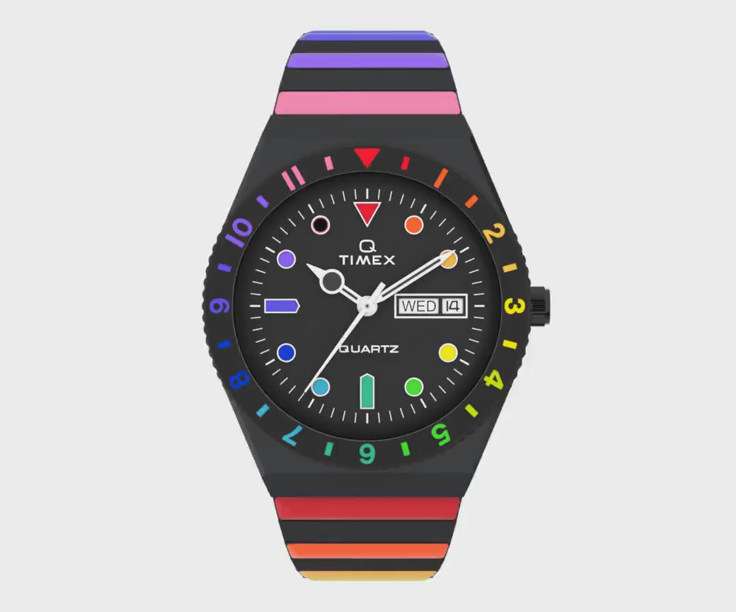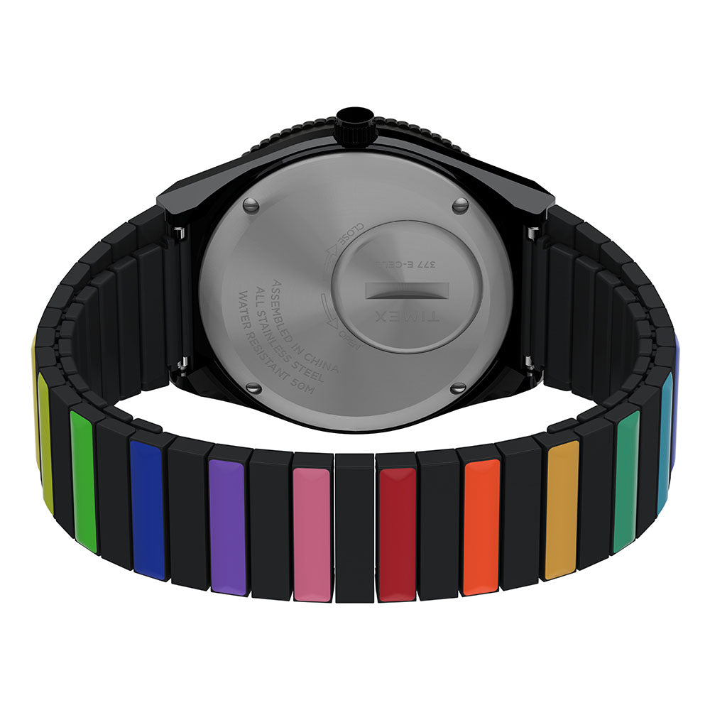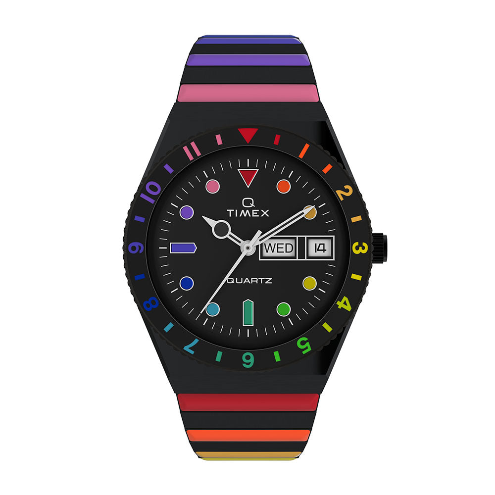 Live life in full color with this vibrant iteration of our archival Q Timex. We stayed true to the unique case silhouette, rotating top ring, and functional battery hatch of its 70s predecessor, but amped up the color with brilliant rainbow accents on the dial and bezel. On the wrist, this watch is as captivating as you might imagine; a black or silver-tone dial and case are complemented by a coordinating Perfect Fit expansion band with alternating rainbow links for a look that'll have everyone asking, where'd you get that??�