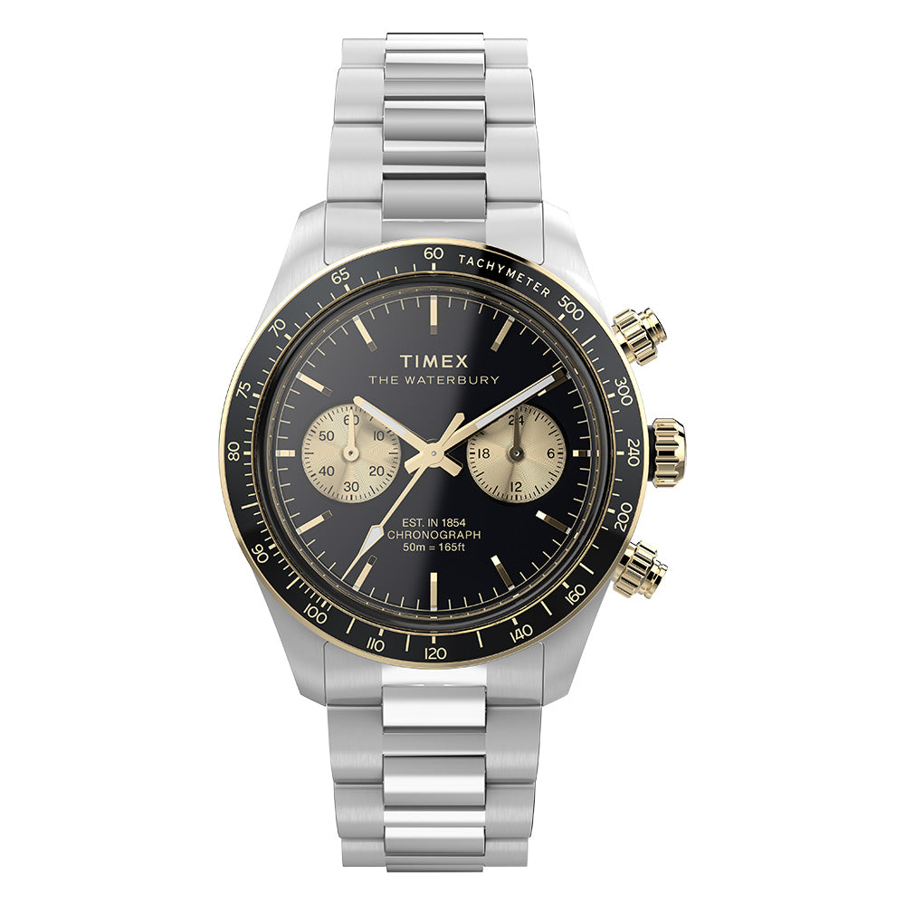 The Waterbury Heritage Chronograph combines modern functionality with timeless design, featuring a chronograph to track elapsed time and a black tachymeter bezel for determining average speed. Encased in a robust 39mm stainless-steel case with vertical brushing, the black dial is accented by contrasting sub-dials and safeguarded by an anti-reflective mineral glass crystal. Luminant hands ensure enhanced visibility, while applied indices and intricate detailing on the crown and pushers add a refined touch. Versatility is key, with a brushed and polished stainless-steel bracelet featuring Perfect Fit self-adjustable links.