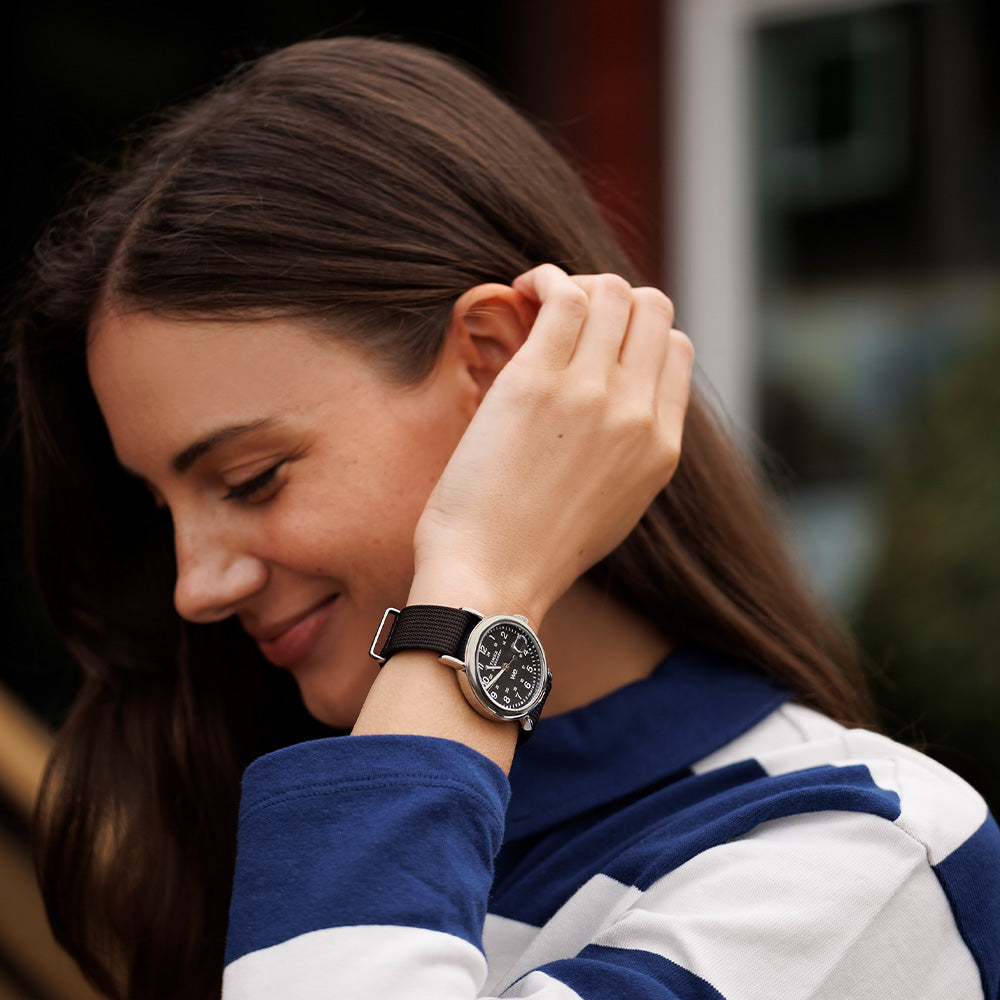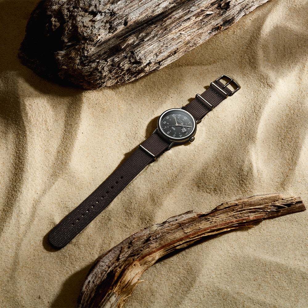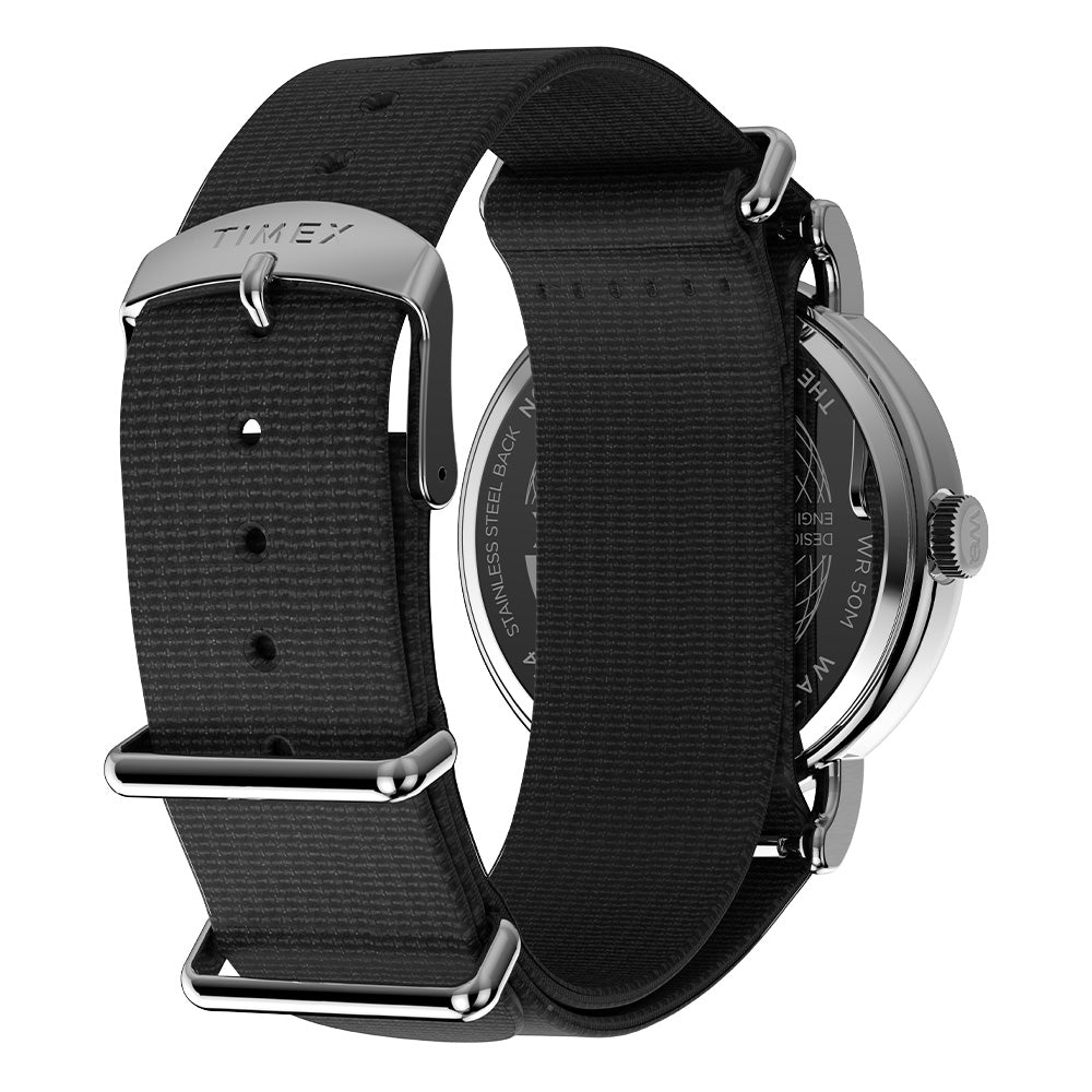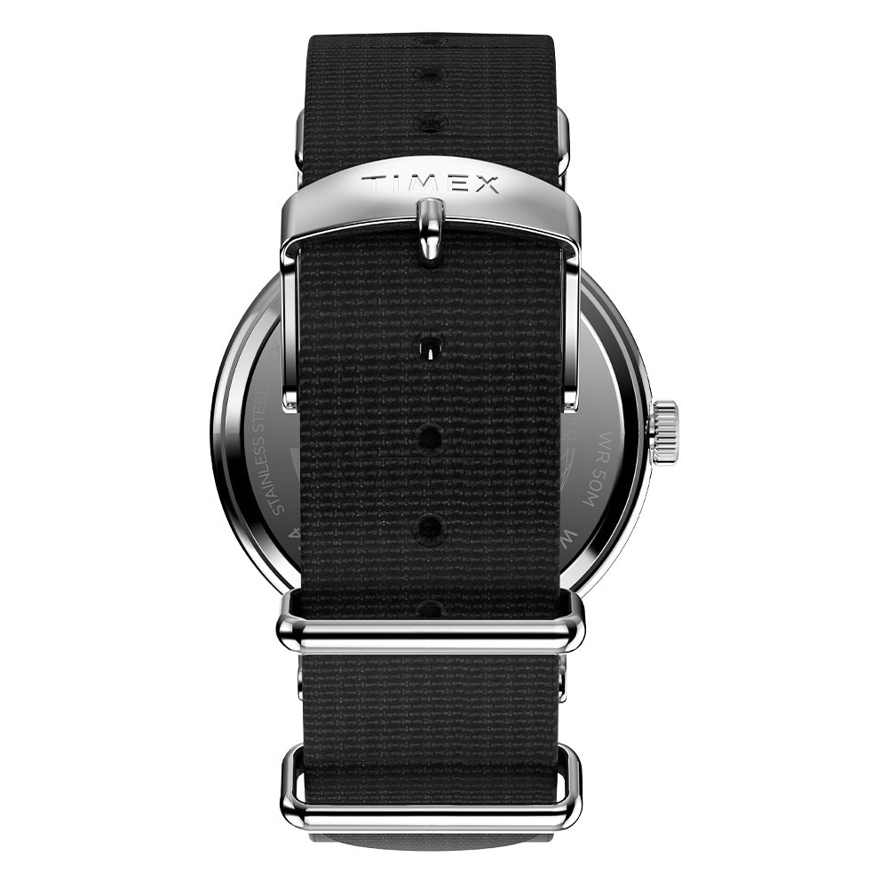 We’re bringing a fresh burst of energy to our beloved Weekender with elevated details, like a sleek new 40mm case, a new crown design, and a slip-thru strap design that makes it easy to swap out the fabric strap for one in another color or print. It’s equipped with luminous hands and our INDIGLO® backlight, and on the black dial, you’ll find a date window complete with a magnifier for enhanced viewing, both 12- and 24-hour time indexes, and the iconic “we.” logo of the Timex Weekender as a reminder that any boring old day can become unforgettable if it’s spent with our favorite people.