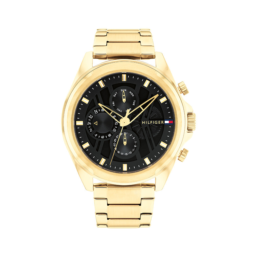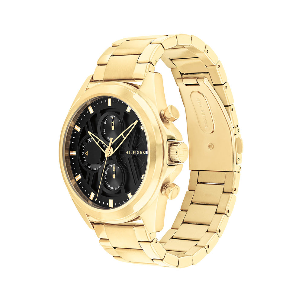 Step into sophistication with this timepiece: a luxurious gold strap complements an elegant black dial adorned with three functional subdials. Designed as the perfect lifestyle companion, this watch seamlessly blends style and functionality, making it ideal for those who value both refinement and practicality in every moment.
