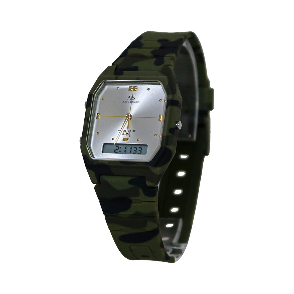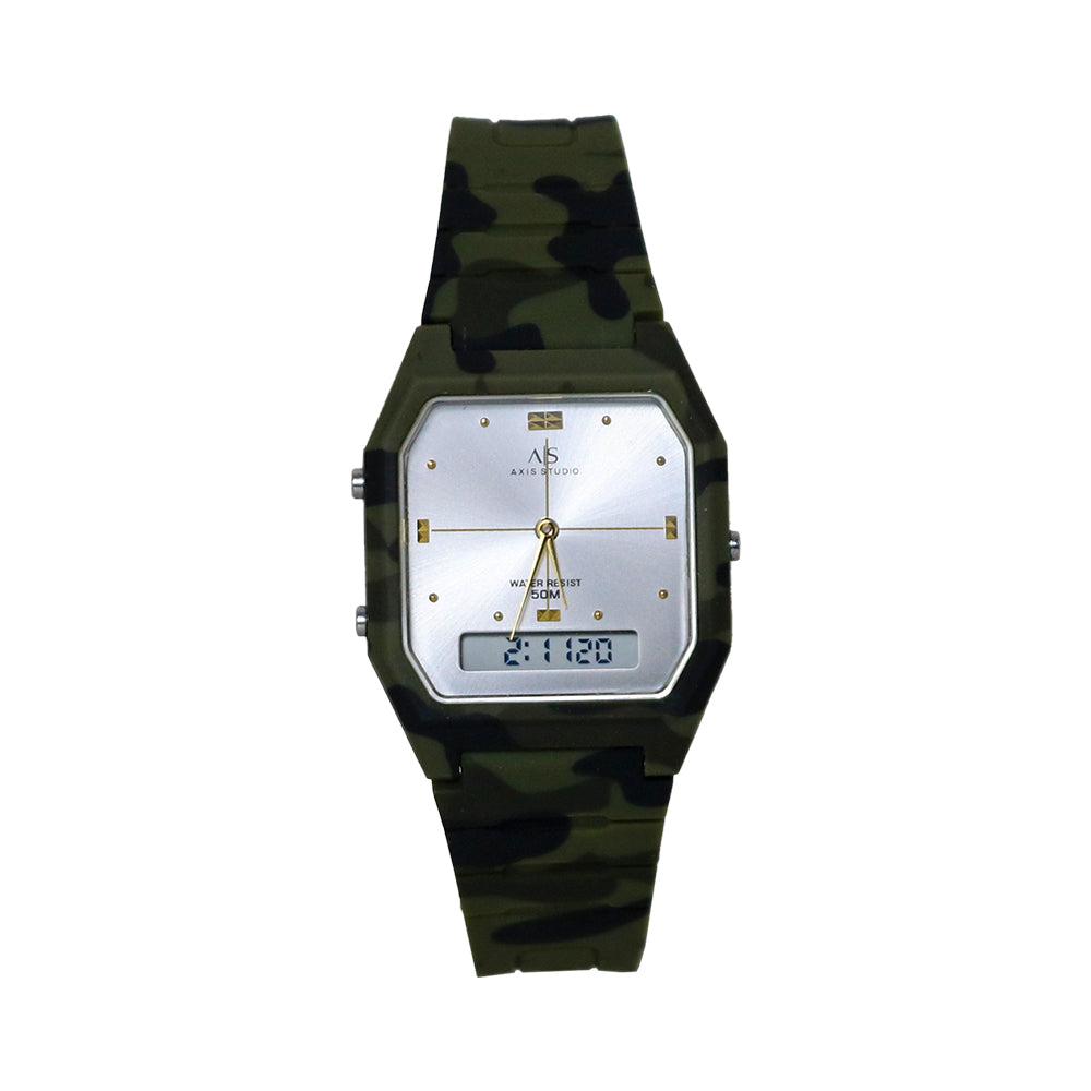 This Axis Studio watch is both affordable and perfect for everyday wear. It features both an analog and a digital watch on a camouflage strap with a silver dial. It is significantly less expensive than other watches but with the same level of quality.