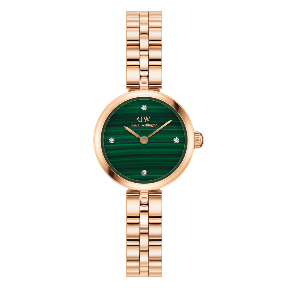 The first crossover between our jewelry and watch collections, Elan Lumine shares the same delicate silhouette and logo design details as its namesake pieces. Features a rose gold 3-link strap and crystals dotting the real malachite dial. Malachite is a natural stone, so there will be variances in texture on each dial—yours will be truly unique.