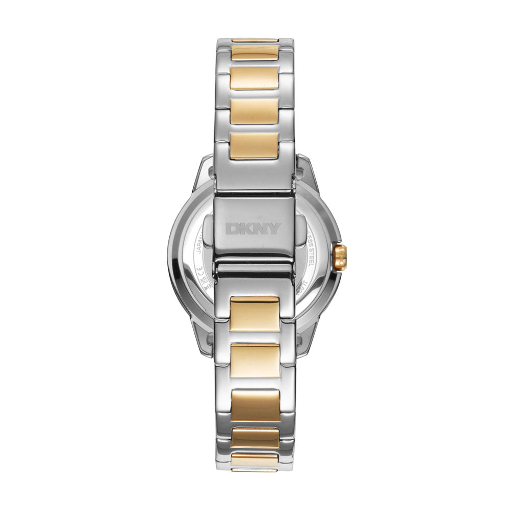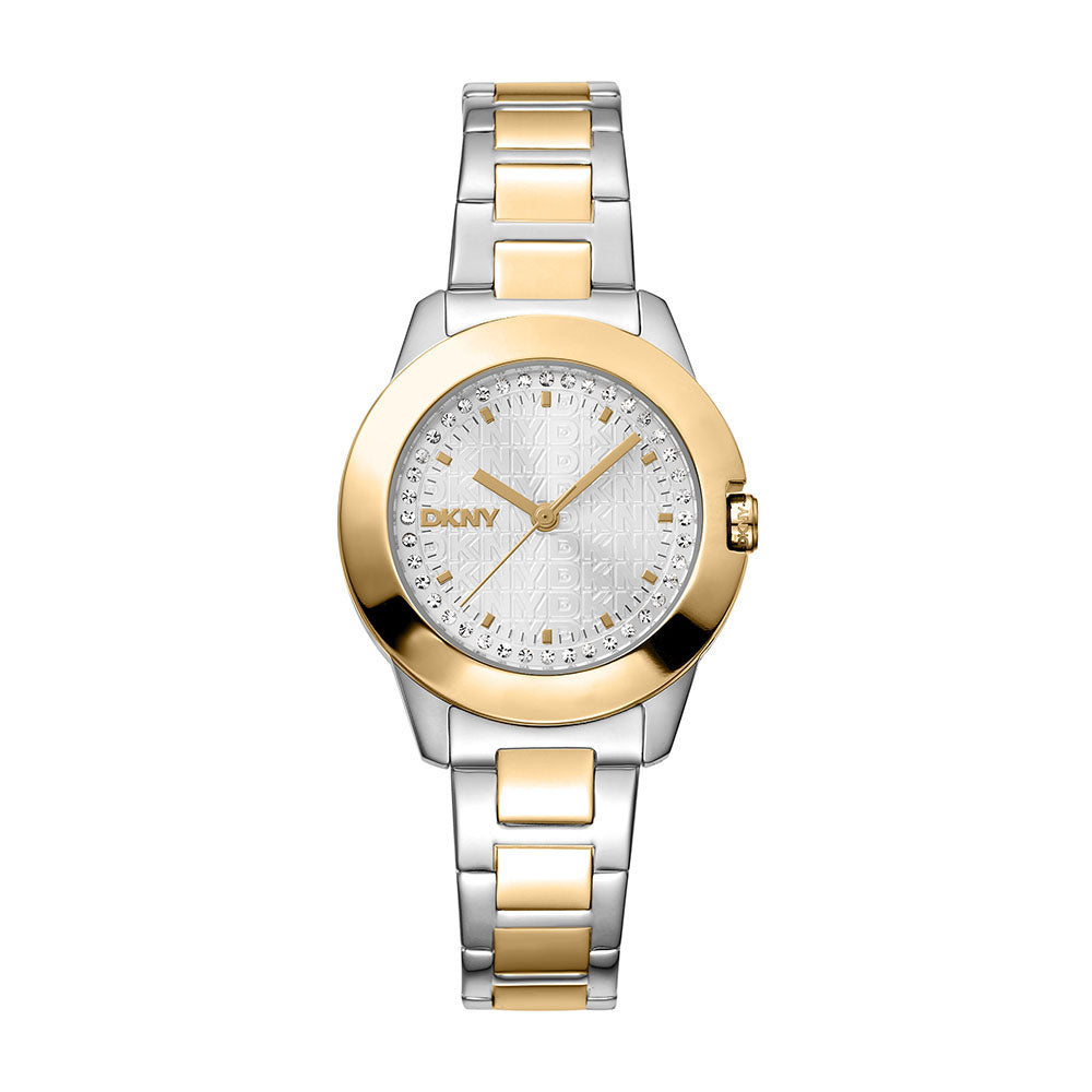 Its 30mm round case features a clean, minimal bezel that contrasts beautifully with the detailed dial, which is adorned with stones around the edge and a tonal DKNY logo repeated across the surface.