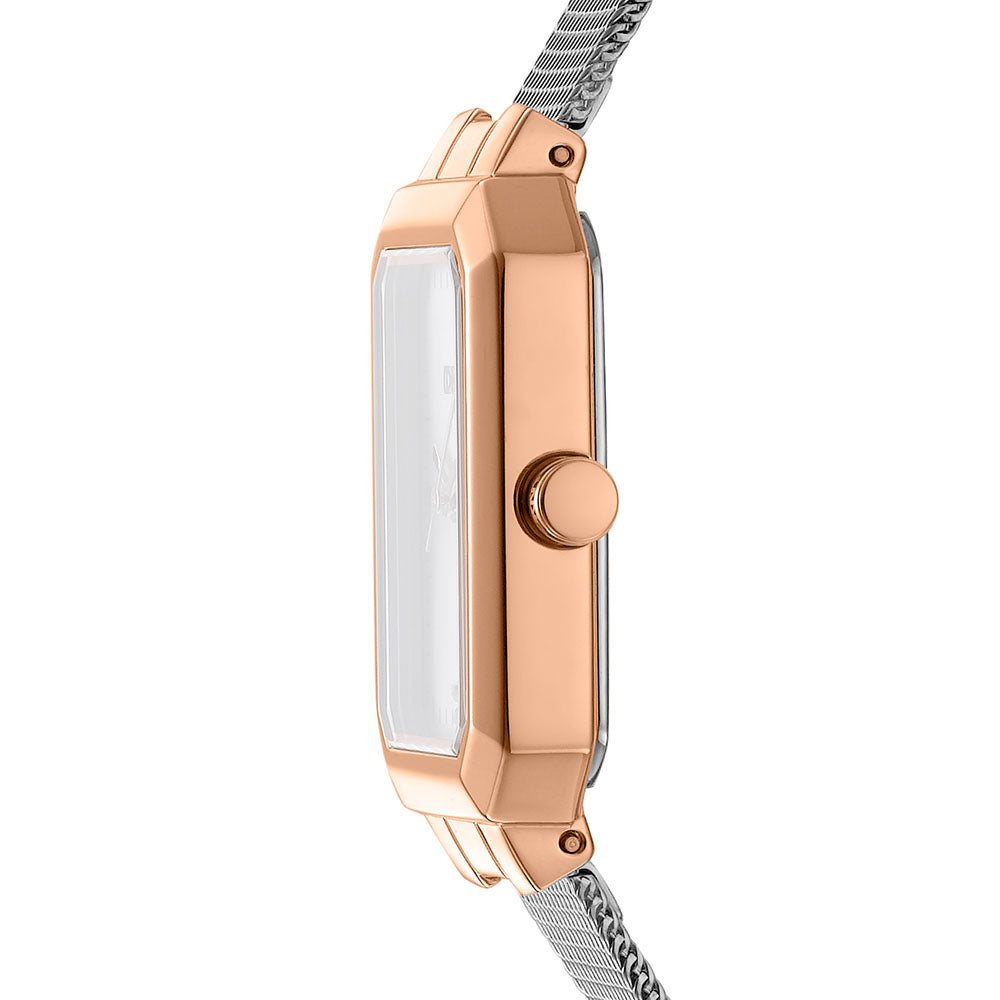 Chic and contemporary, this timepiece blends urban sophistication with modern flair. Featuring a rose gold-tone rectangular case, a sunray silver dial, and a stylish stainless steel mesh bracelet, it's the ultimate statement for city living.