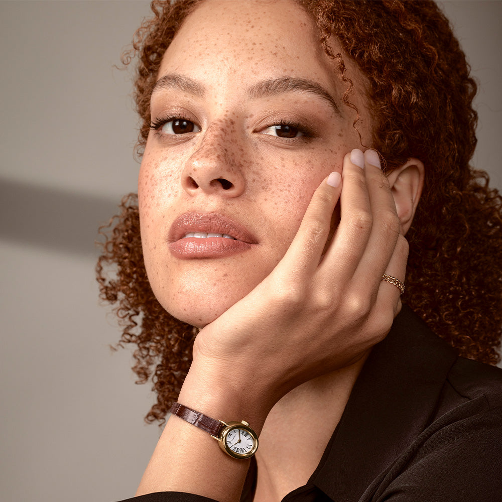 Our newly redesigned Cavatina remains faithful to its petite roots with a polished 19mm case in a classic oval shape that whispers a timeless elegance on the wrist. The delicately domed mineral crystal harmonizes with the smooth curvature of the case, while sophisticated Roman numerals grace the clean white dial. Completing its feminine profile is a brown petite tapered leather strap with an enticing crocodile grain that's as on-trend as it is timelessly stylish.