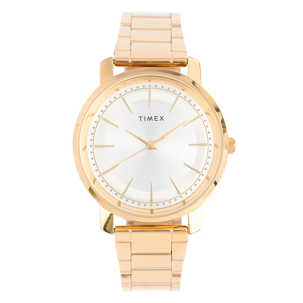 This Timex dress watch combines elegance and simplicity with a 38mm gold-tone case and a minimalist silver dial. Featuring three polished hands for a refined look, it’s a timeless piece that elevates any outfit with its modern, understated style. Perfect for any occasion, this watch offers reliable performance and classic appeal.