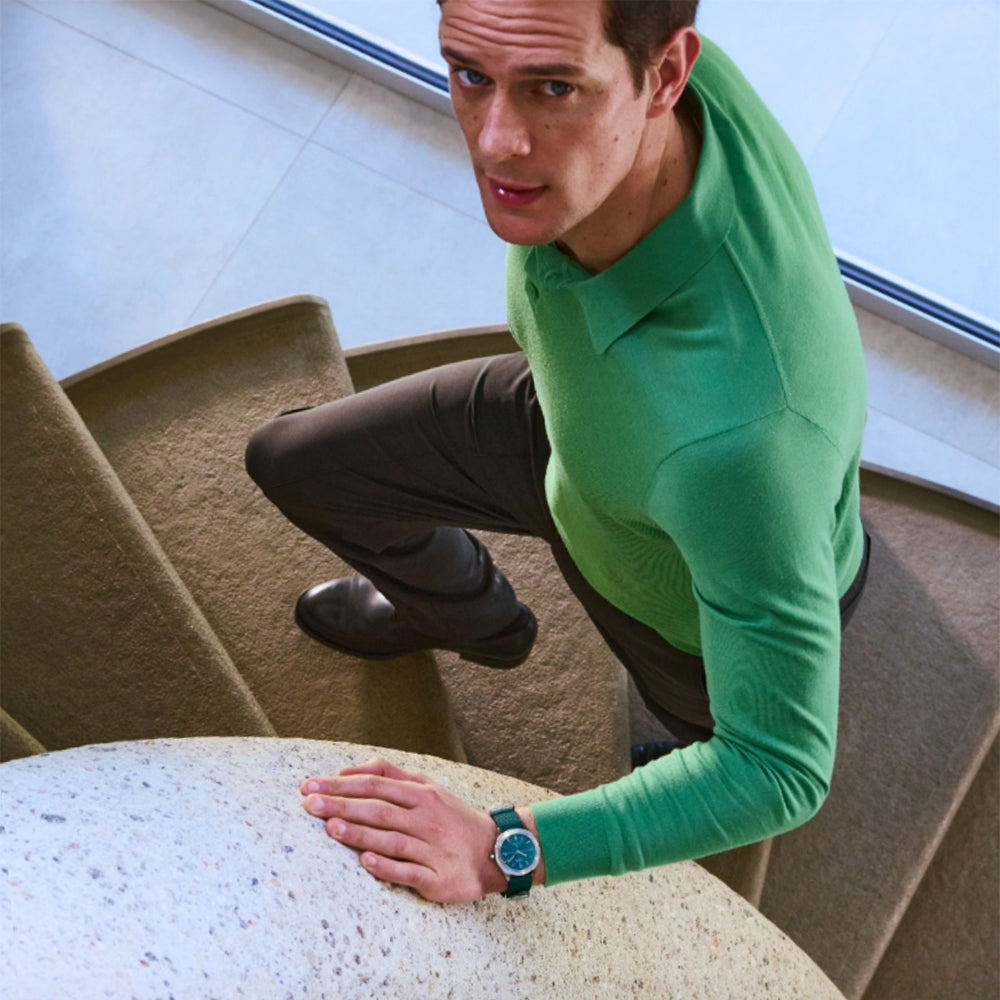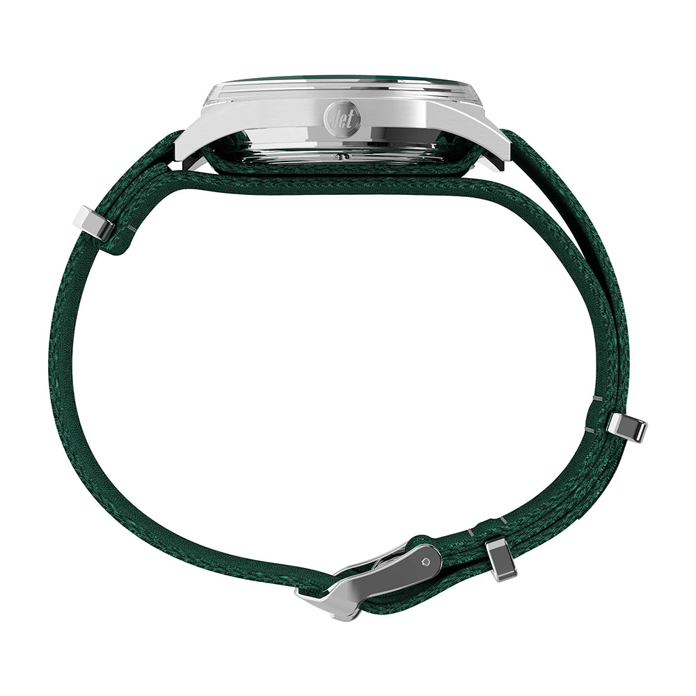 Our Marlin Jet captures futuristic design ideals of the ‘60s with understated details and a sleek 38mm brushed stainless-steel case. However, its most defining feature is the domed crystal. Made from Hesalite—a refined form of acrylic favored for its clarity and ease of maintenance—the crystal covers the entire top surface of the watch case, enveloping the grooved bezel bearing the Marlin name and bringing captivating depth to the watch's retro-futuristic appearance. It blends seamlessly into the flat case sides, leaving only the lugs exposed. The case sides smoothly transition to a screwed-on exhibition case back that mirrors the crystal’s domed contour, enhancing the watch’s streamlined profile and space-age aesthetics. You’ll find a concentric circle pattern in three key locations on this timepiece: beneath the dome on the inner bezel, on the crown, and on the case back. The black, green, or blue matte concave dial showcases a crosshair pattern punctuated with a date window beside the 3 o’clock marker. Completing the look, we’ve paired the Marlin Jet with a double-layered black, green, or blue woven perlon strap that introduces a subtle textural element to its clean design.