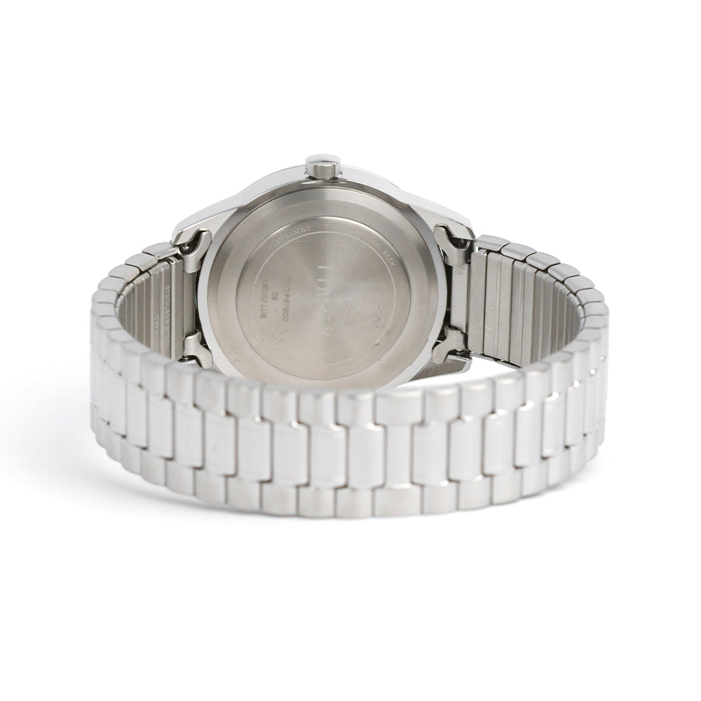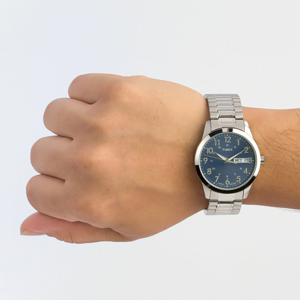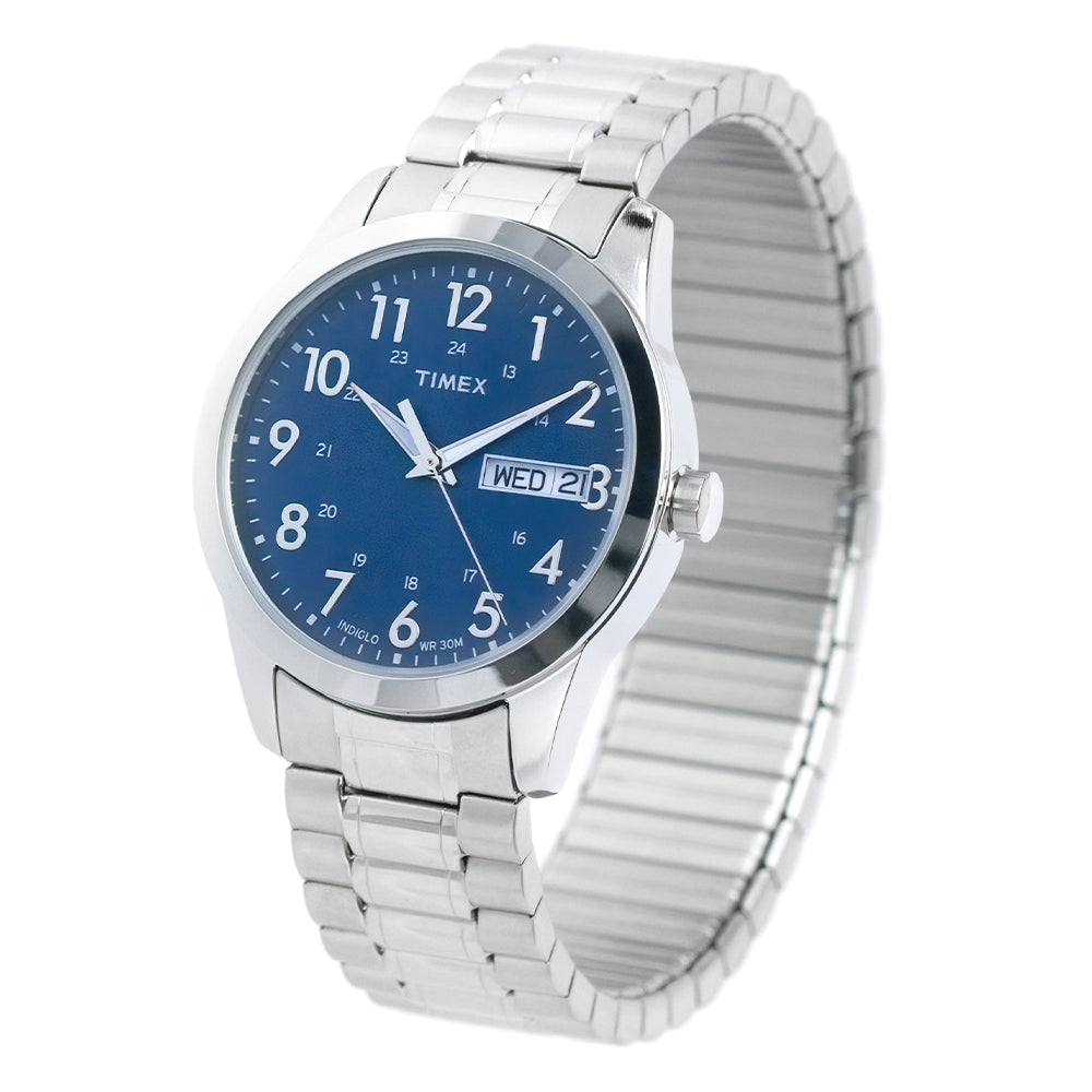 Designed for simplicity and legibility. Featuring a blue dial with full Arabic numerals and a day/date window, this watch ensures easy time reading at a glance. The polished silver-tone stainless steel case and expansion band add a touch of elegance, making it suitable for both casual and formal occasions. Equipped with Timex's INDIGLO night-light, it allows you to read the time in low-light conditions with the push of a button.