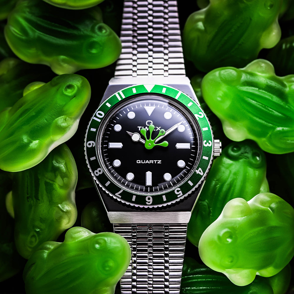 As a play on the nickname given to the color combo on the dial and bezel of our ‘70s Q Timex, seconde/seconde/ has injected a dose of fun into one of our most iconic watches. At first glance, it’s your typical Q—complete with stainless-steel case and bracelet, rotating bezel, functional battery hatch, luminous dial markings, and domed acrylic crystal— but take a closer look, and you’ll notice a customized second hand that playfully nods to the black dial and green bezel. We could spell it all out for you, but we’ll let you connect the dots. Flip the watch over, and you'll find that the case back is engraved with a unique edition number.