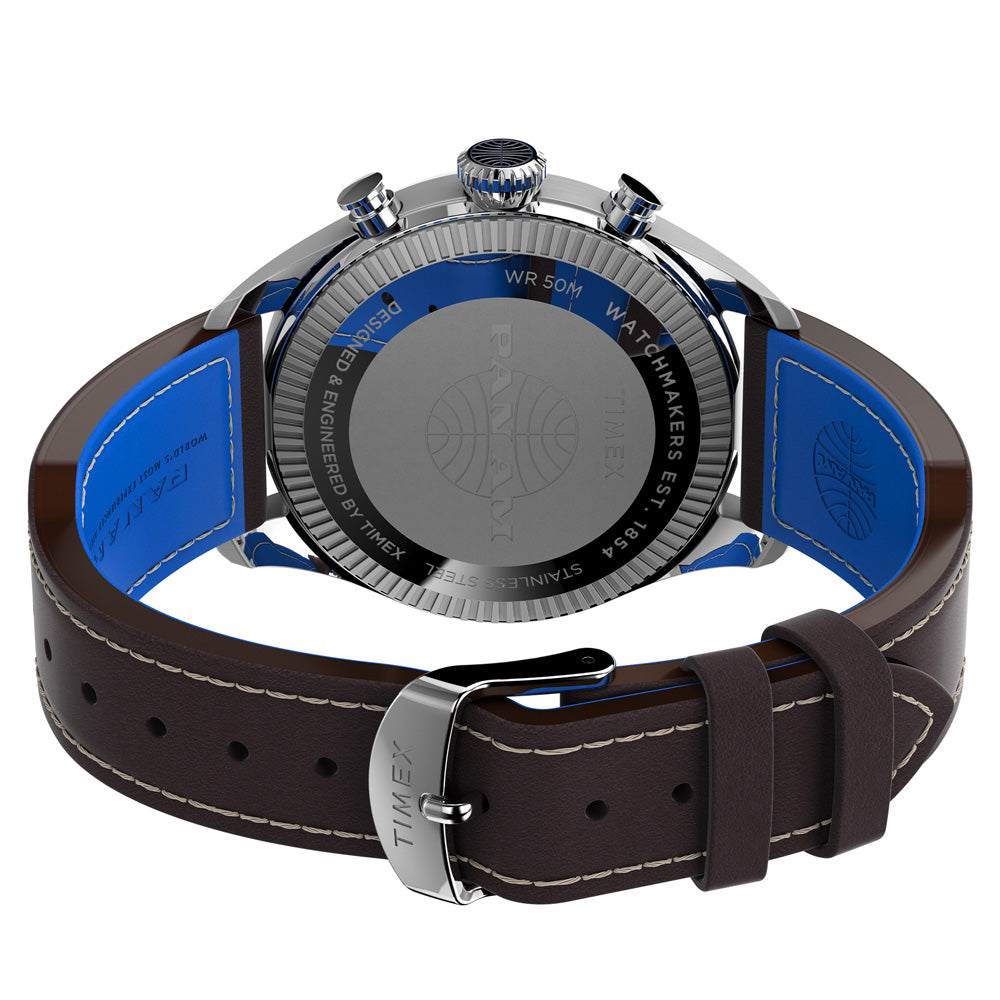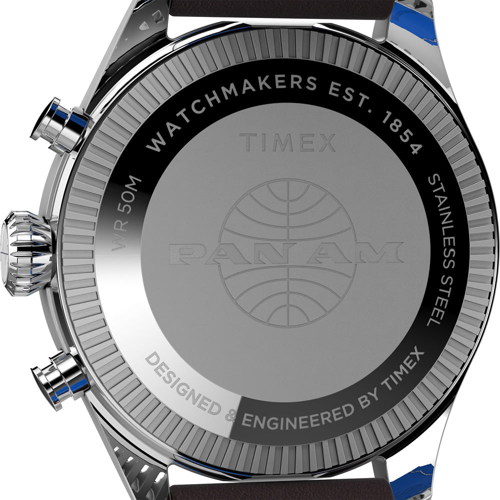 A signature Timex® collection takes flight. In proud partnership with one of the world’s most iconic global airlines, the Timex x Pan Am® Waterbury celebrates the industry leader’s rich heritage of aviation. Featuring the 42mm stainless-steel case construction of our classic Waterbury, we’ve channeled the precision, ergonomics, and unencumbered legibility all but required by early aviators as they took to the skies, incorporating bold Arabic indices on its uncomplicated navy-blue dial. With a chronograph movement and brown leather strap featuring Pan Am’s unmistakable “globe” accent plates, the result is a nostalgic tool watch that captures the spirit of American ingenuity.