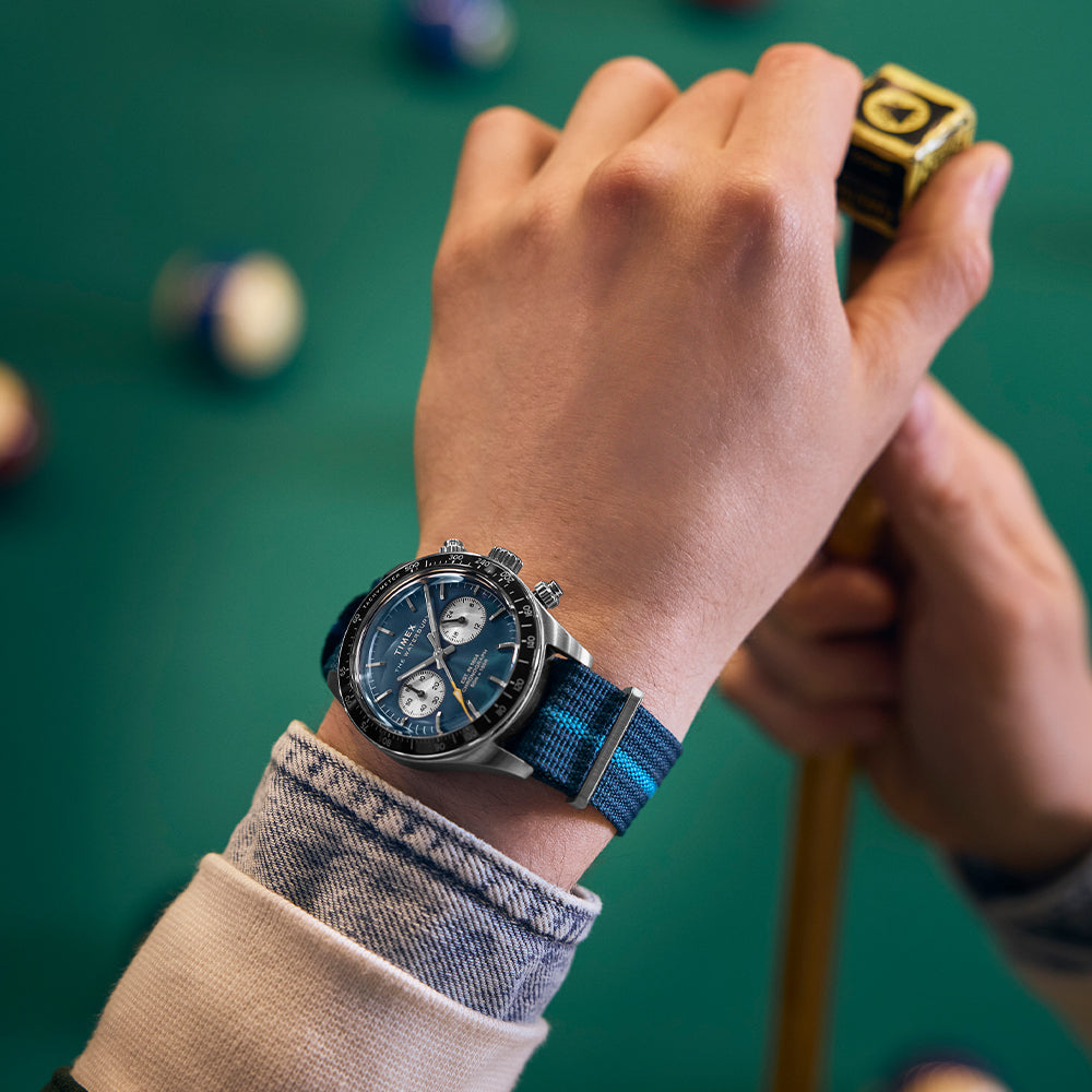 The Waterbury Heritage Chronograph combines modern functionality with timeless design, featuring a chronograph to track elapsed time and a black tachymeter bezel for determining average speed. Complementing its 39mm brushed recycled stainless-steel case is a striped recycled fabric strap that channels the effortless tailoring of classic American menswear. Double-layered for durability and designed with convenient slip-thru construction for easy on and off, it delivers a laid-back confidence on the wrist. The black or silver-tone dial is accented by contrasting sub-dials and safeguarded by an anti-reflective mineral glass crystal for enhanced clarity. Luminant hands ensure visibility in lowlight conditions, while applied indices and intricate detailing on the crown and pushers add a refined touch.