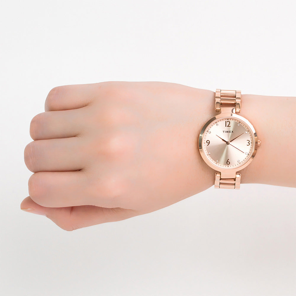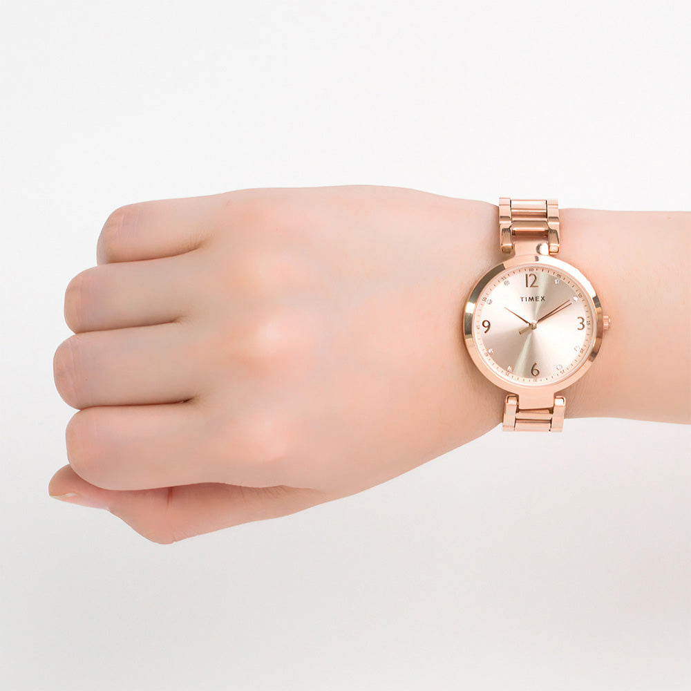 This fashionable analog watch for ladies features rose gold accent case and stainless steel bracelet. the chic design of the rose gold dial donned with stones and arabic as markers provides a trendy display of the time. over-all, the stunning rose gold accents creates a perfect balance of elegance and simplicity, that will help exude confidence to every woman wearing it.