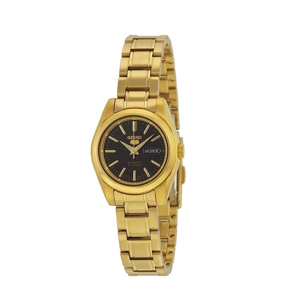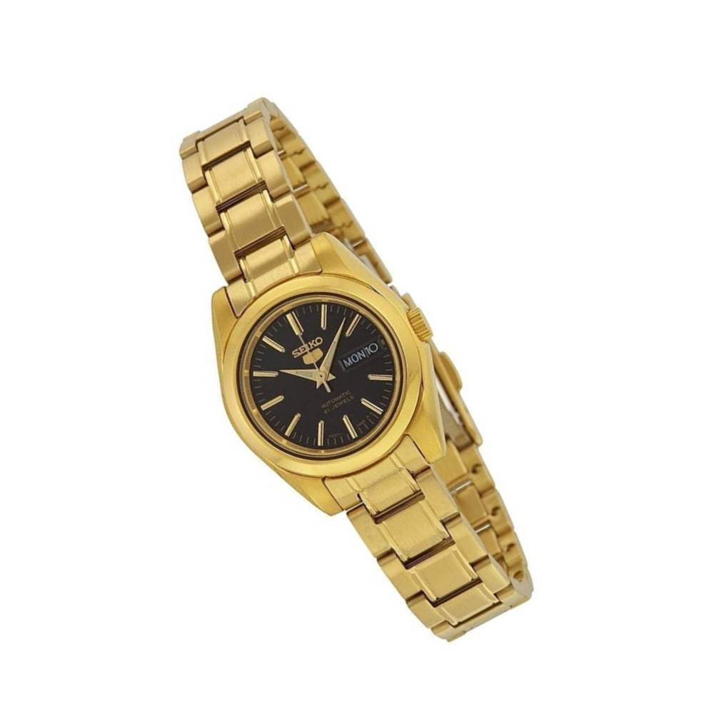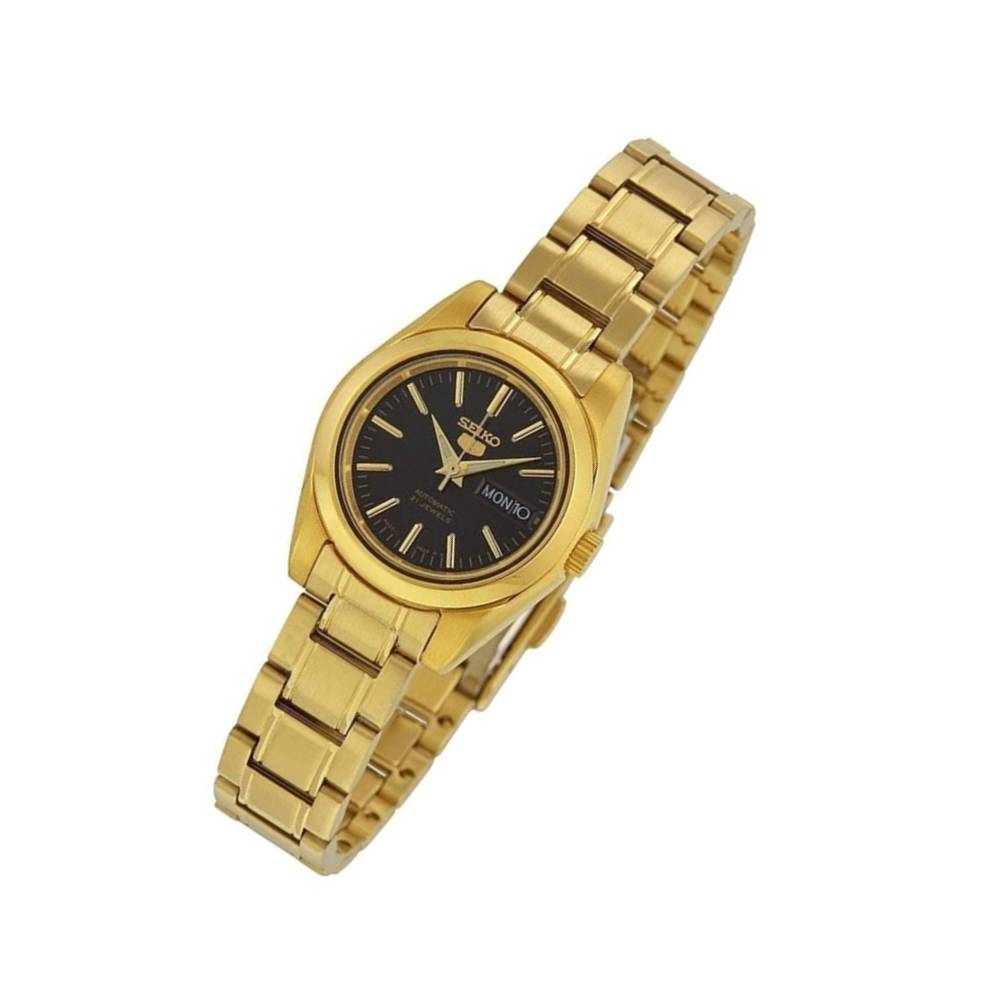 The Seiko SYMK22K1 pairs a sleek 25mm stainless steel case with a striking gold-tone bracelet, creating a bold contrast against its deep black dial. Powered by reliable automatic movement and protected by a durable Hardlex crystal, it features a day-date display and secure fold clasp. Lightweight yet resilient with 30M water resistance, this watch is perfect for everyday elegance.