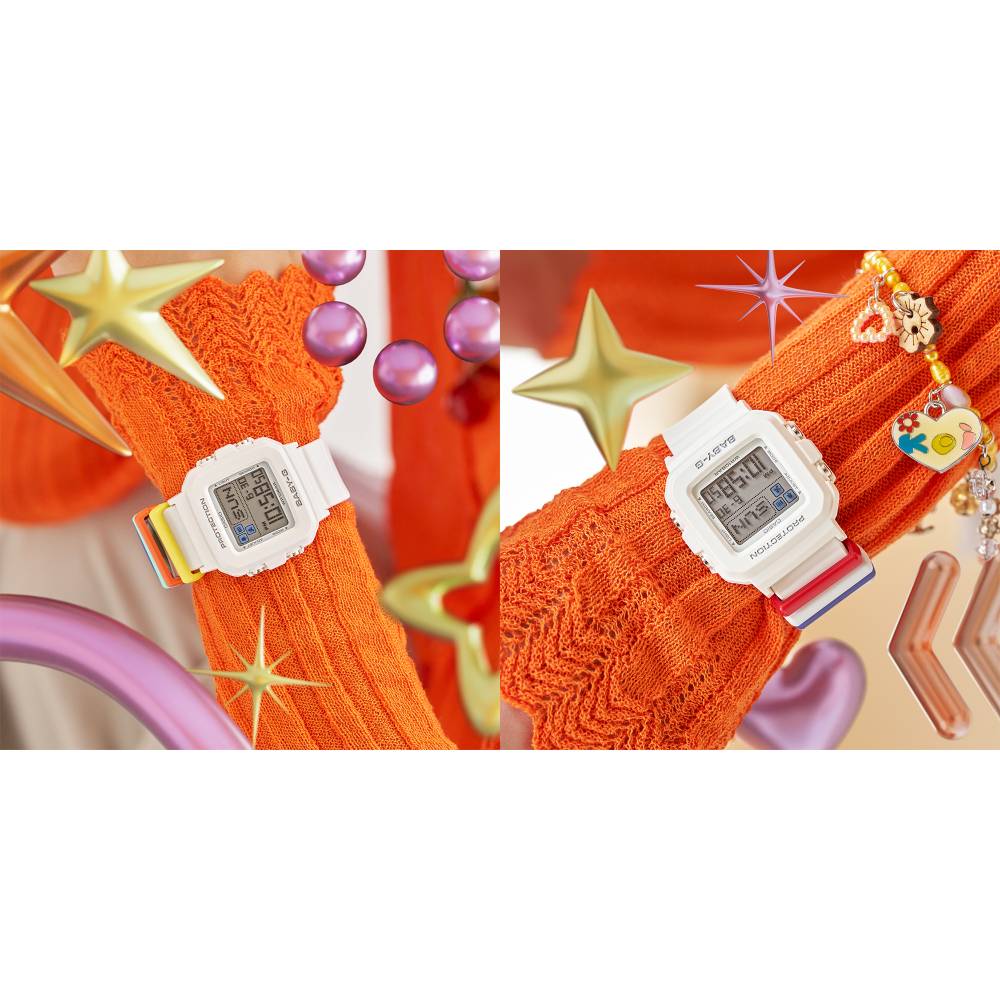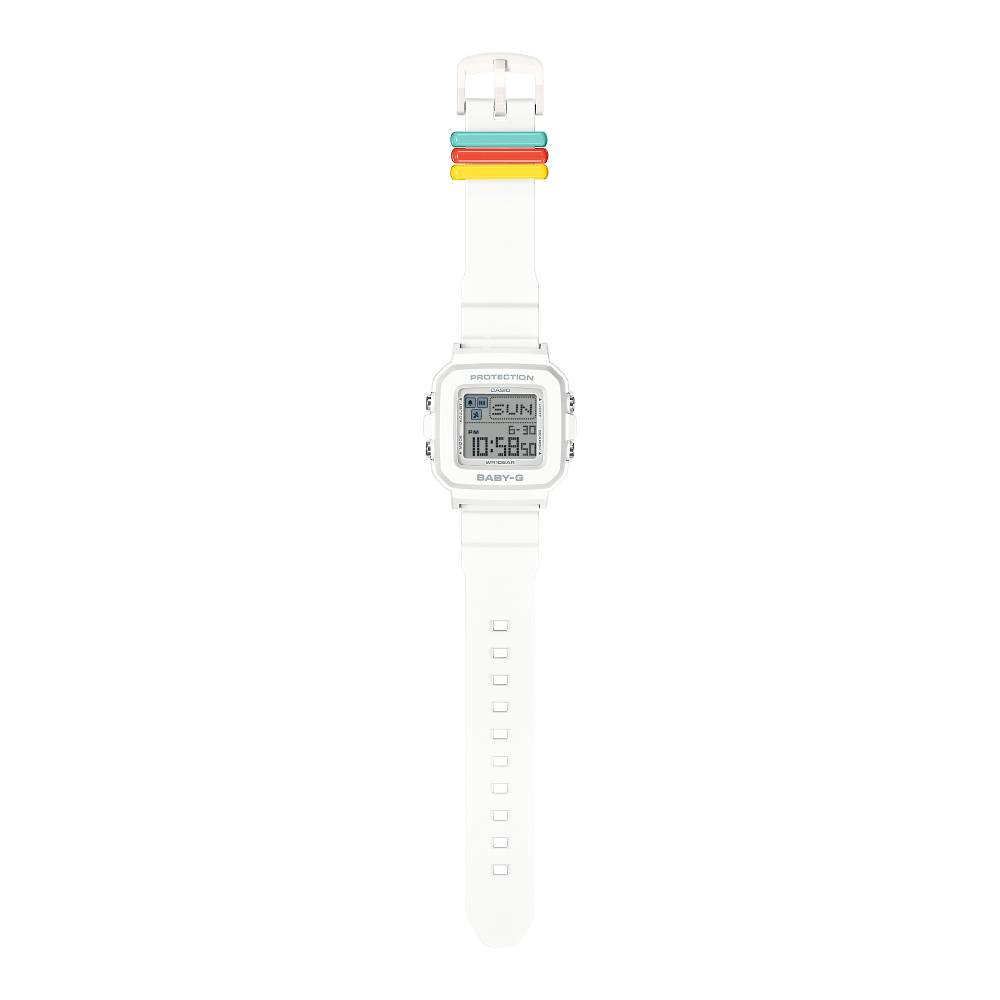 Mix, match, make it your own! Introducing an exciting convertible watch with interchangeable band loops from the BABY-G+PLUS line of super fun watches. Just customize it for a sweet style that’s all your own. The watch comes wearing three band loops and employs a pass-through band. Simply remove the band — no special tools needed — and then design your day using any of the nine included band loops. With all this colorful fun, you can mix, match, and combine to create your very own custom design. The nine band loops come in seven solid colors and two translucent hues for an array of diverse textures and colors. Your imagination is the limit — create your own individual wrist accessory to suit your mood and fashion each day. Press the light button in Timekeeping Mode for a random series of pixel-art animations (surfer, dancer, dolphin, blowfish, dog, cat) that add a bit of playful fun and a sweet charm to the watch face. Not just amusing, but practical, as well. The BGD-10L also delivers shock-resistant construction and 100-meter water resistance.