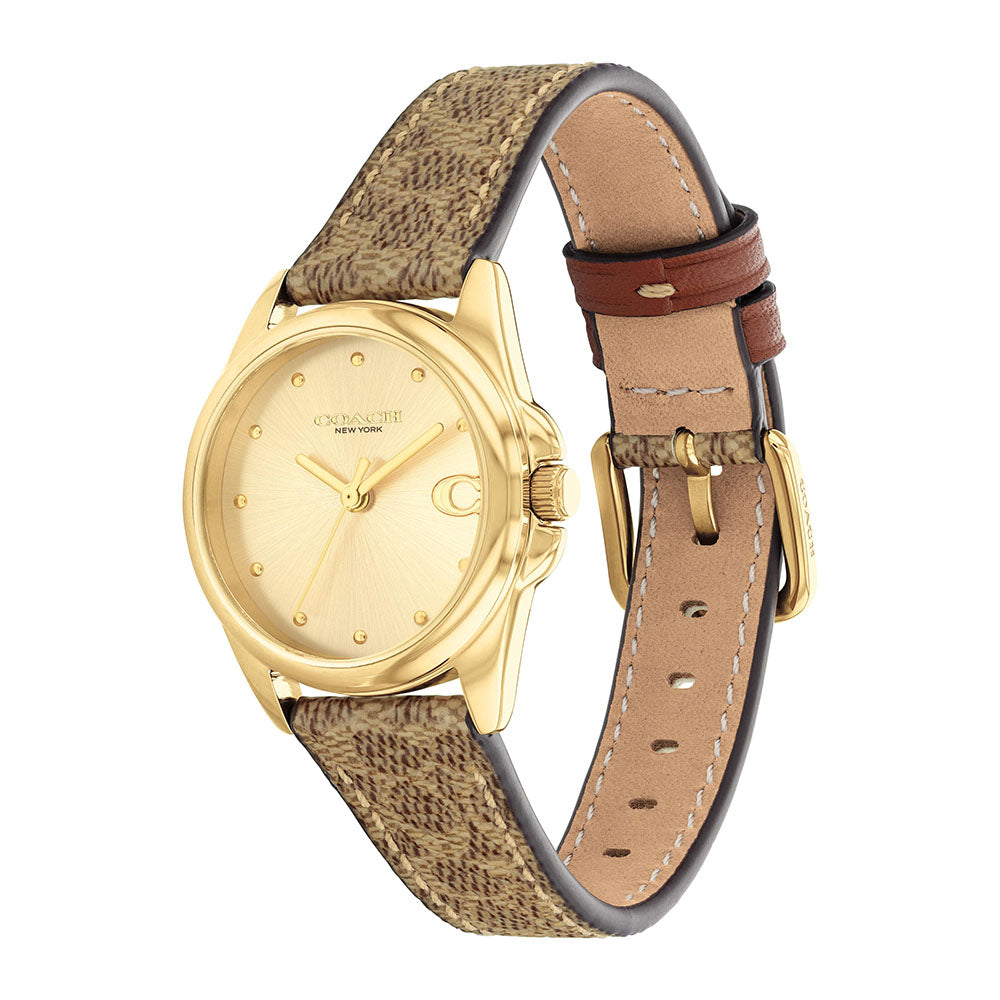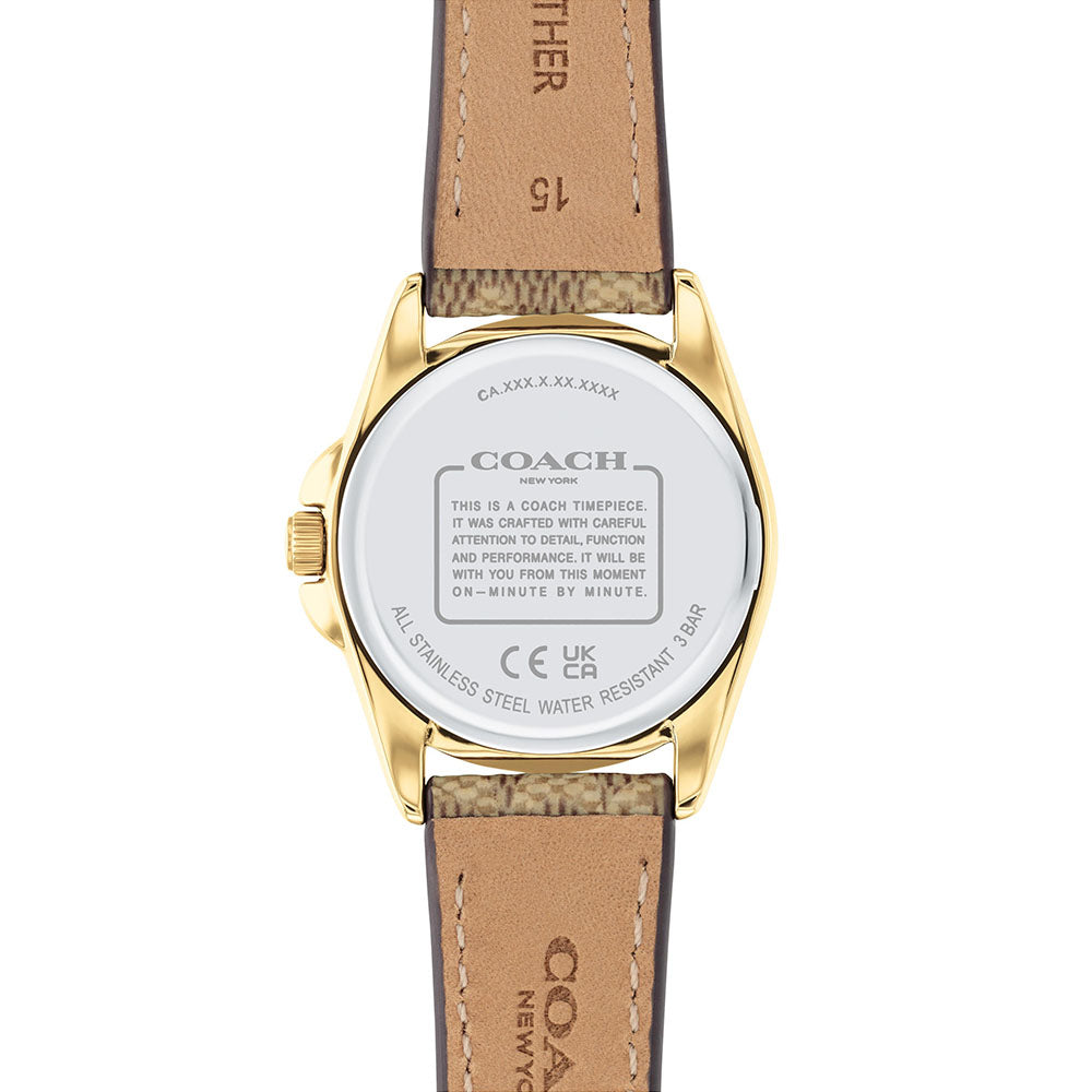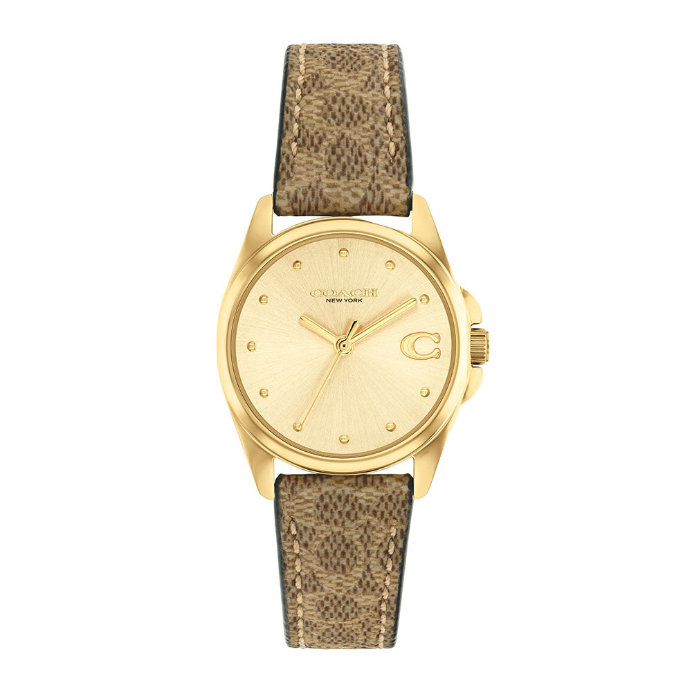 The epitome of refined sophistication, Greyson is a polished, go-everywhere timepiece. Finished with a tan Coach'signature canvas strap, the gold tone design features a sweeping second hand and a Coach'signature marker at 3 o'clock.