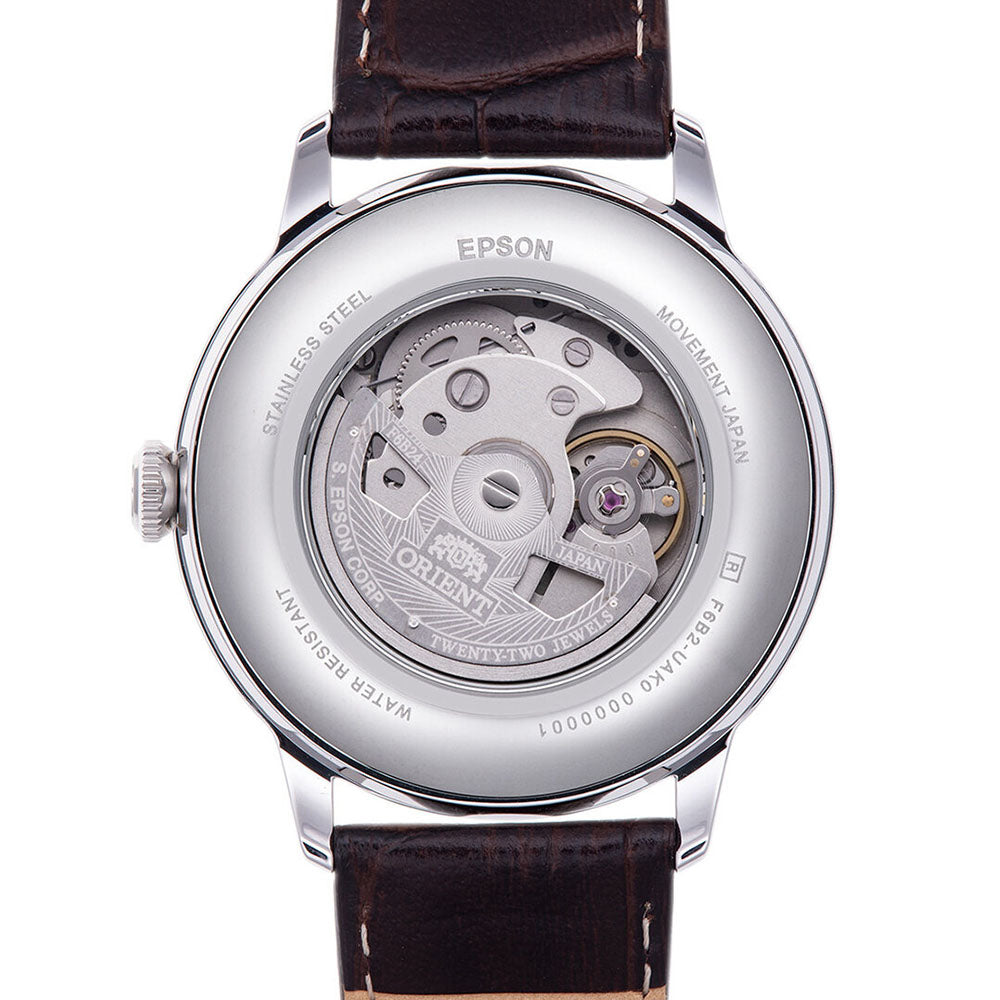 The Orient Classic Bambino Sun & Moon features a unique day and night display showcasing the passage of time with a sun and moon disk that rotates once every 24 hours. This series comes in several variations depicting magical scenes of the sun and moon during the morning, noon, evening, and night.