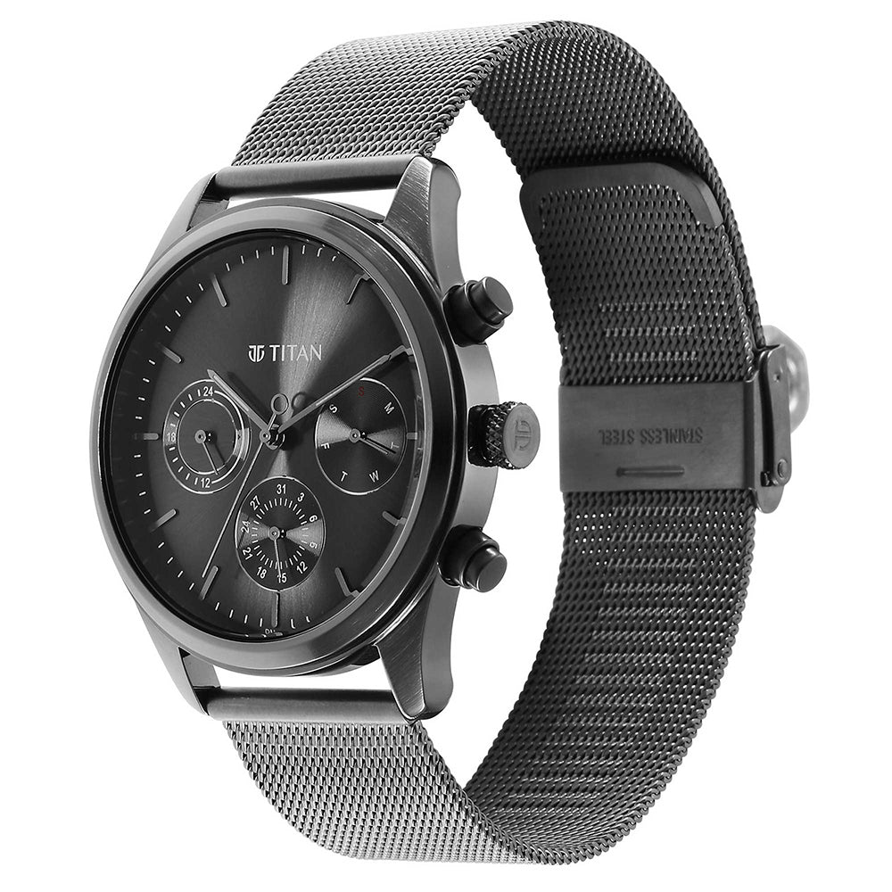 If you're drawn to night sky, intrigue, and dark colours, the new Titan Noir is for you. With a delicate multi-layered dial, black metallic plated straps, and metal indices that exude elegance, this watch is a timeless classic.