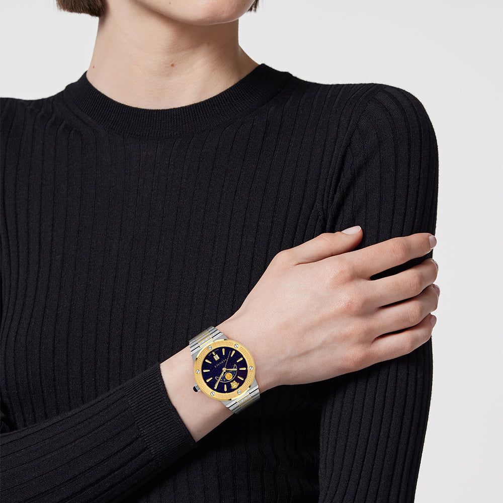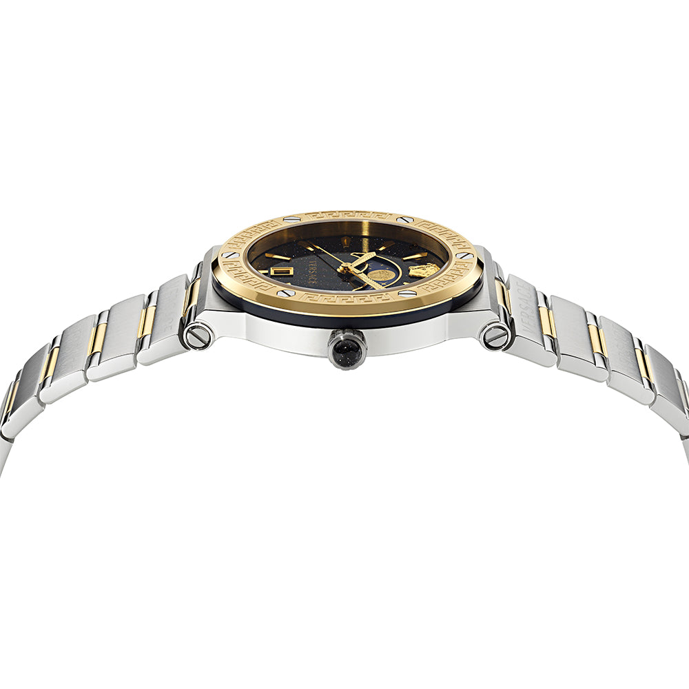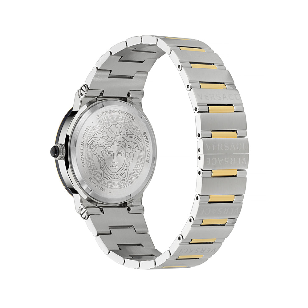 A contemporary timepiece combining geometric shapes and feminine style, Greca Logo Moonphase features round-shaped case that stands in contrast with the rectangular bracelet links. The top ring is marked by the screws and the Greca motif, which gives an immediate recognition of the Brand reinforced by the Versace logo at 6 o?clock and the Medusa head at 12h. The moonphase window is visbile in the upper part of the dial, featuring all the phase of the moon in a very elegant and chic way.In the bracelet version, the timepiece's sleek design is completed by the Versace logo alternately repeated on the links.