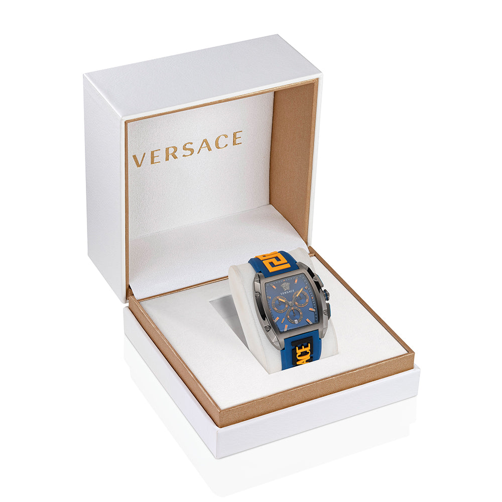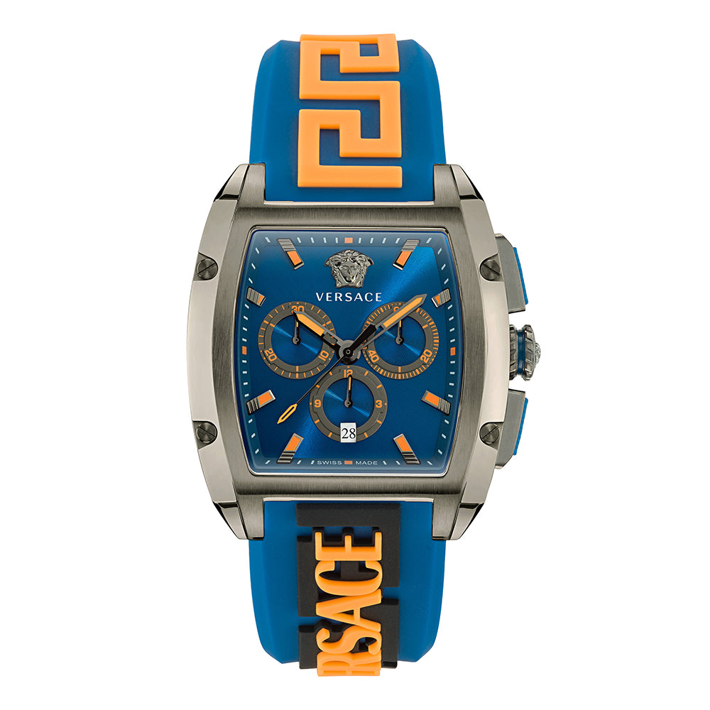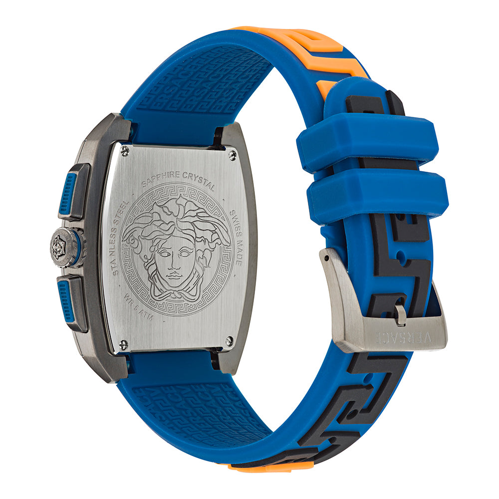 Following the latest trends, the collection embodies the Versace DNA in this bold tonneau case body. The watch hosts a chrono movement with 3 counters. To flag the silicon strap version where the Versace logo meets the Greca creating a new masculine and eye-catching pattern.