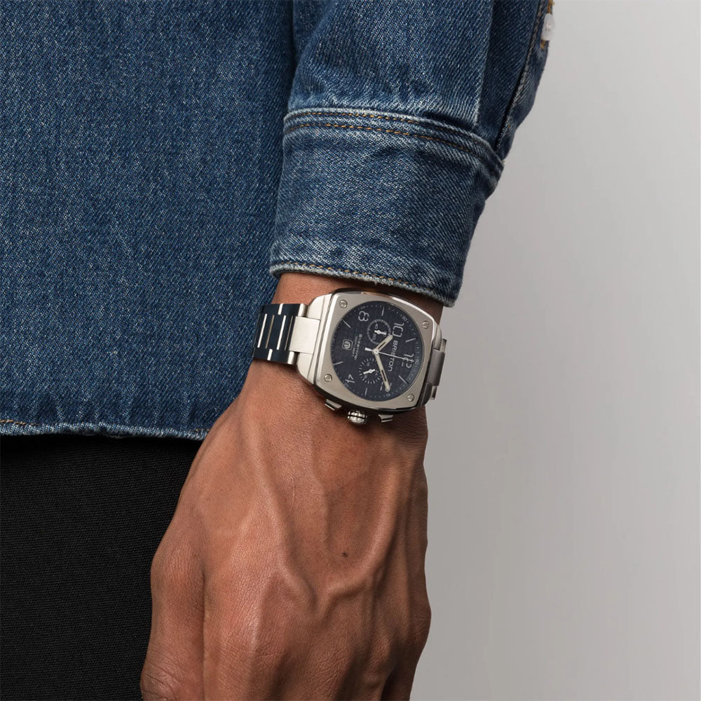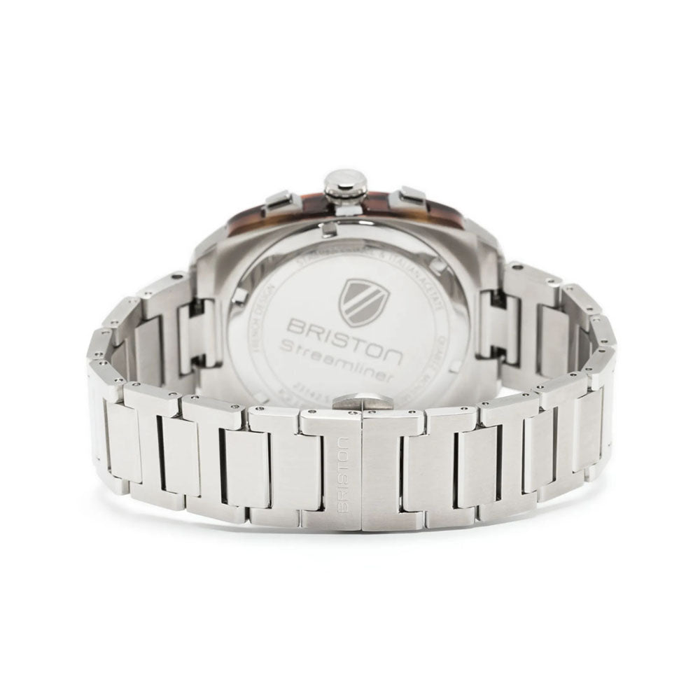 Brown acetate case with a silver-tone stainless steel bracelet. Fixed brown stainless steel bezel. Blue dial with silver-tone hands and Arabic numeral & index hour markers. Minute markers around the outer rim. Dial Type: Analog. Luminescent hands and markers. Date display at the 6 o'clock position. Chronograph - two sub-dials displaying: 60 second and 24 hour. Miyota Caliber OS21 quartz movement. Scratch resistant mineral crystal. Pull / push crown. Solid case back. Cushion case shape, case size: 42 mm. Band width: 20 mm. Fold over clasp with a safety release. Water resistant at 100 meters / 330 feet. Functions: chronograph, date, GMT, second time zone, hour, minute, second. Streamliner Series. Fashion watch style. Watch label: Japan Movt. Briston Streamliner Blue Dial Men's Watch 23142.S.T.15.SB.