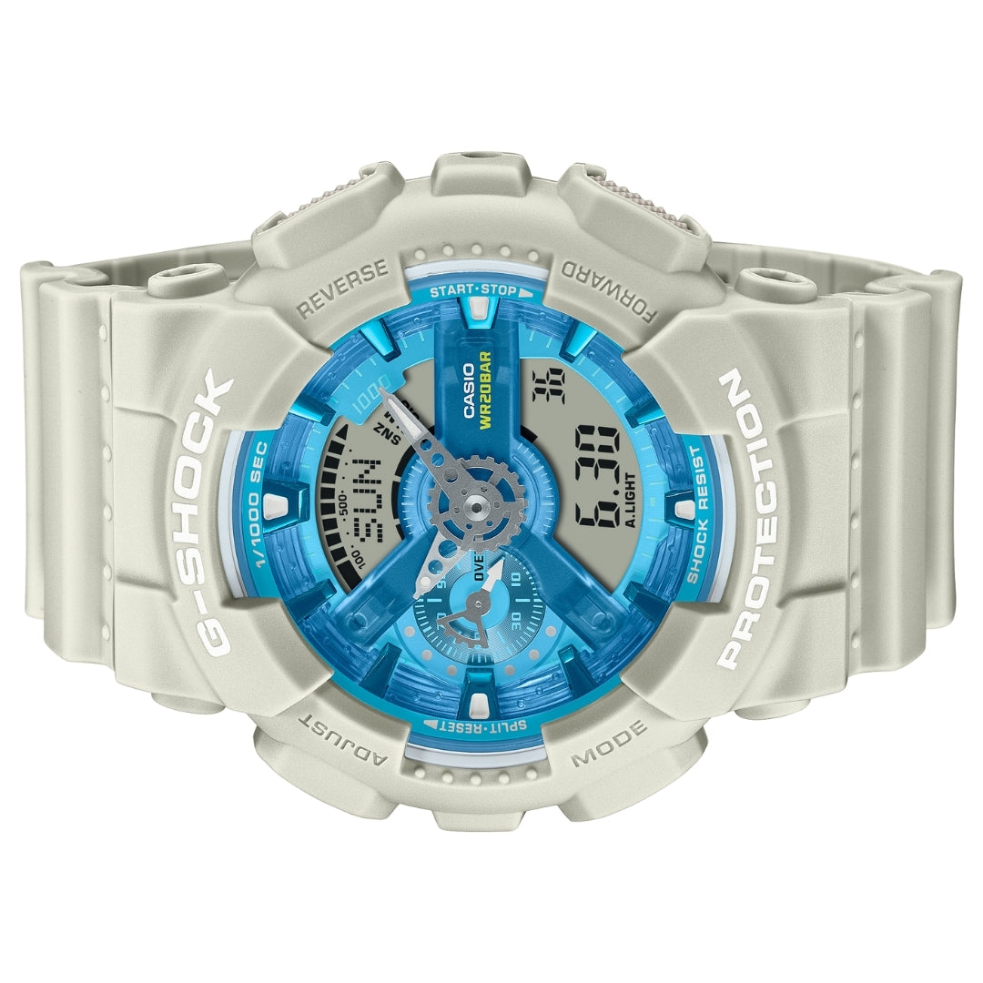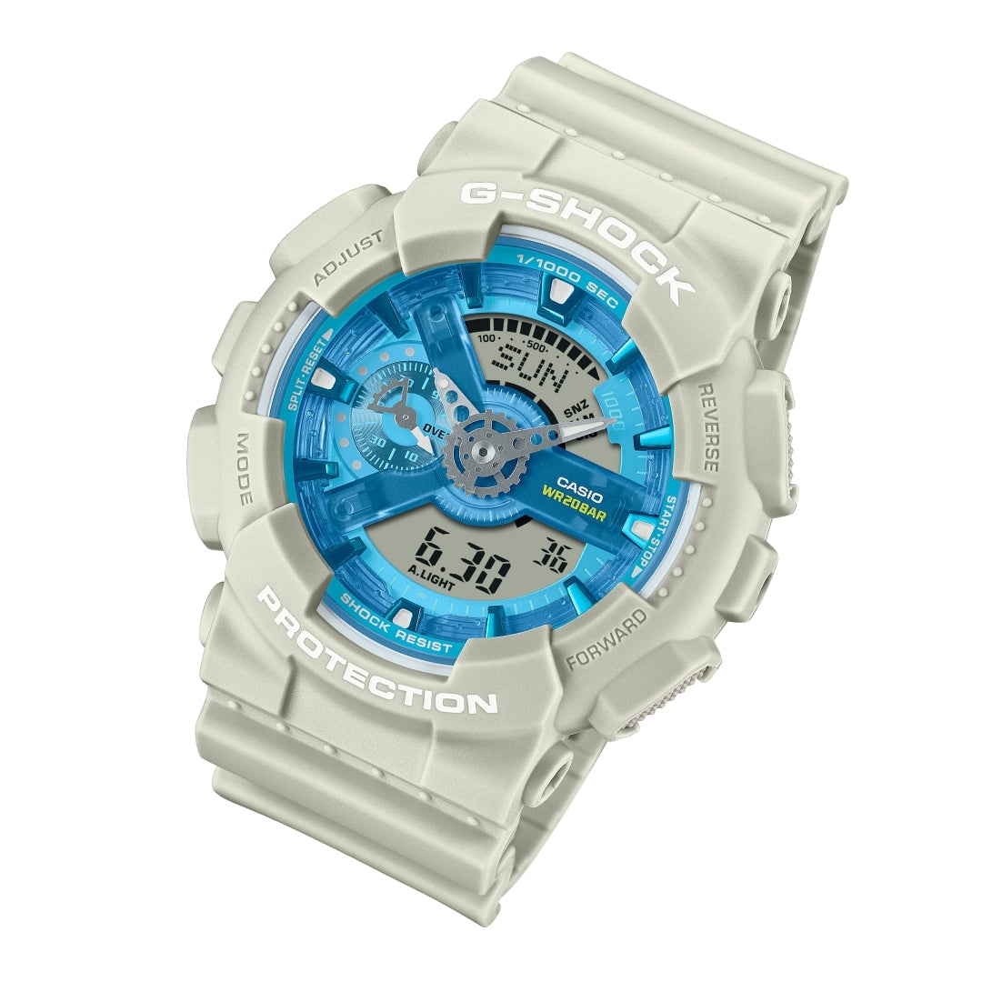 The tough and rugged GA-110 start with a base color of desert sand beige. Then inspired by the refreshing sanctuary of an oasis lake, touches of blue-green accent the dial, conjuring glistening cool waters that reflect the rays of the sun.