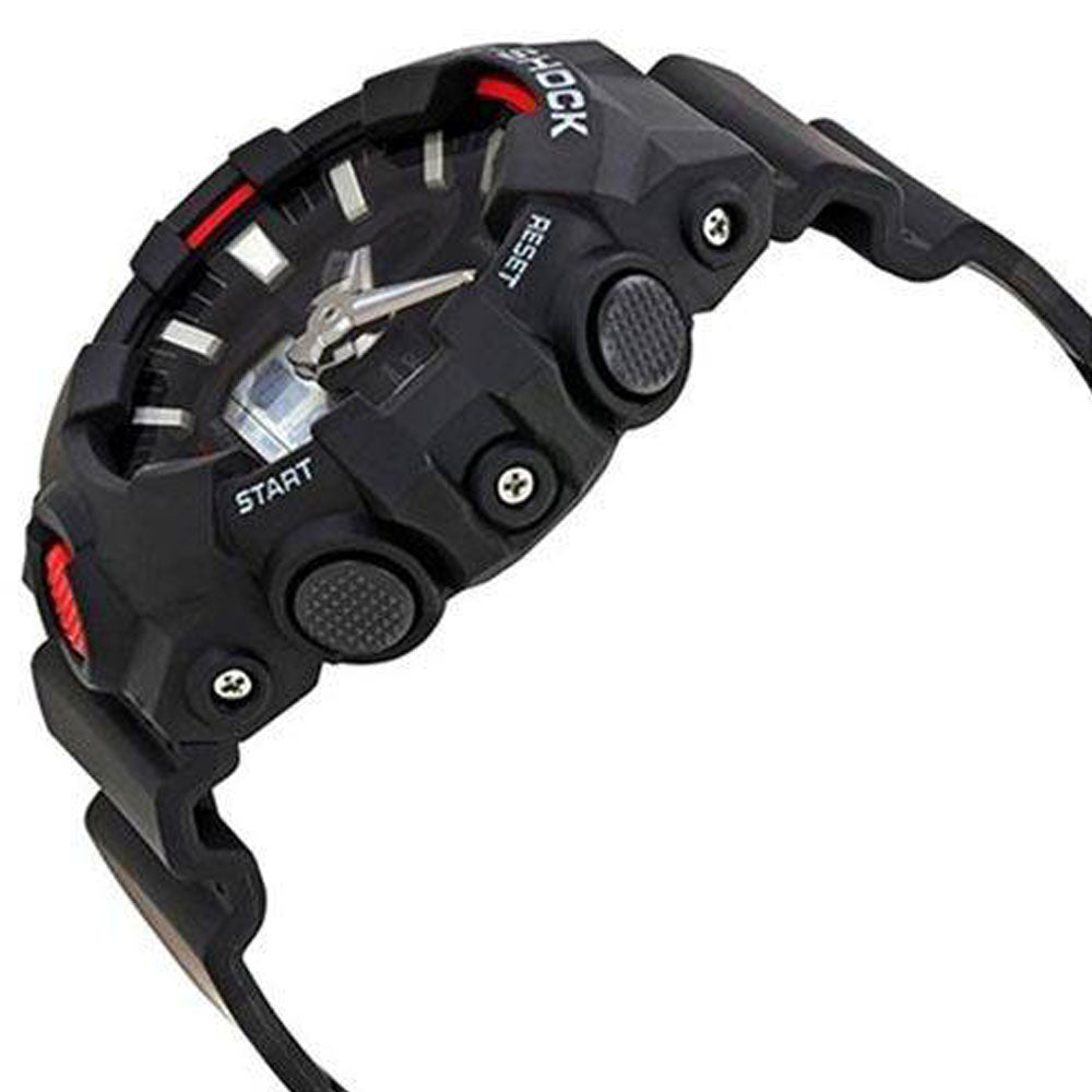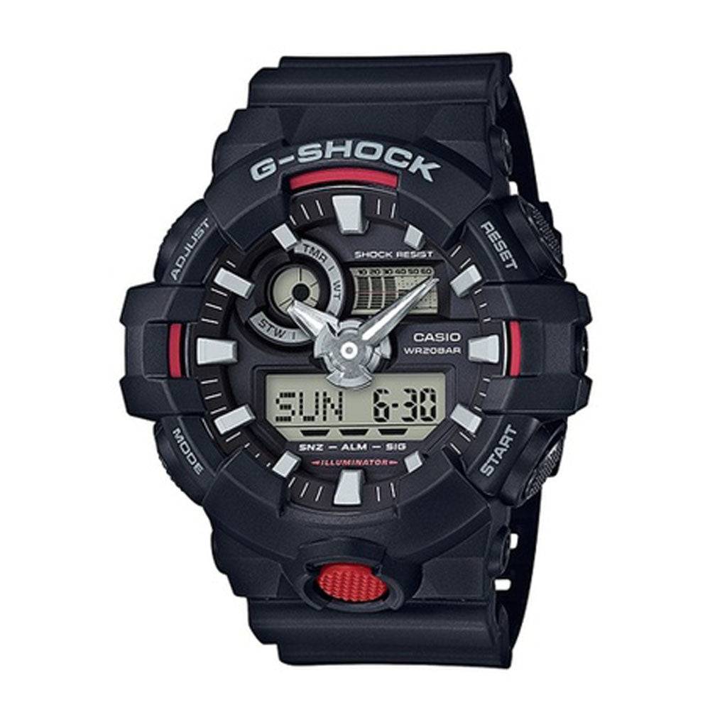 From G-SHOCK, the watch brand that is constantly setting new standards for timekeeping toughness, comes the new GA-700 analog/digital combination model. Multi-dimensional hour and minute hands look as if they were carved out of a piece of metal for a powerful and bold design. The new form of these watches not only improves reading, it also projects a feeling of toughness. A front button at 6 o'clock adds to the dynamic, leading-edge styling. The three color schemes of these models were carefully selected to reflect the brand concept. Black-and-red, black, and red capture the spirit of toughness these models are designed to represent. All the practicality of the analog-digital format, high-brightness LED illumination, a hand shift function and much more all add up to the best in timekeeping convenience. A 3D face combining with a distinctively tough design makes the new GA-700 models look dynamic and tough.