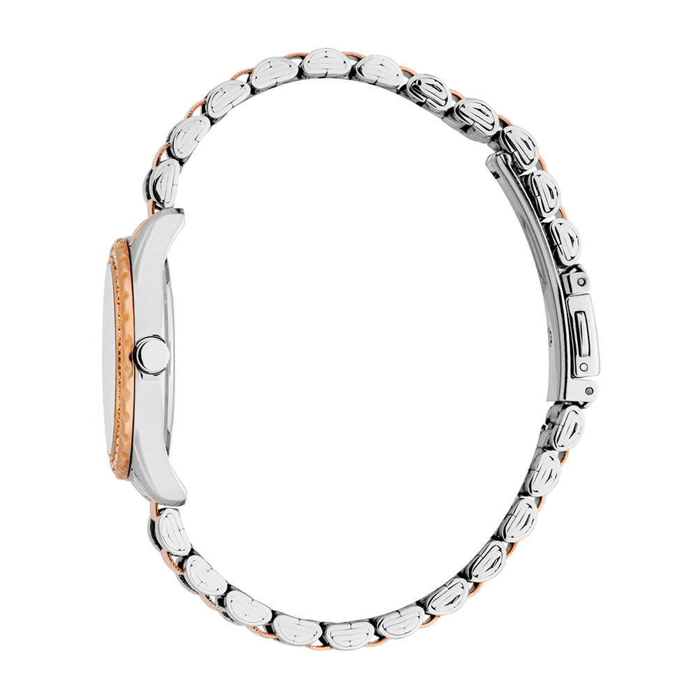 A symphony of grace and glamour. The silver dial, adorned with timeless precision, finds its perfect complement in the captivating blend of rose gold and silver tones on the strap. This watch is not just an accessory; it's a statement of refined elegance, seamlessly fusing classic design with contemporary allure, ensuring you make an impression wherever time takes you.