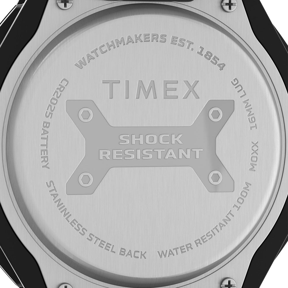 Our Command Encounter collection is proof of our legendary durability and attention to detail. Clocking in at a substantial 45mm, this military-inspired digital timepiece features an octagonal, shock-resistant case a key attribute we've emphasized on the case back beneath the classic Timex logo. A negative LCD display modernizes its rough and rugged design aesthetic, although rest assured this isn't just for show the watch is water resistant up to 100 meters and showcases additional utilitarian features any adventurer or outdoor enthusiast will appreciate: a chronograph, timer, and alarm; INDIGLO® backlight technology; and resin straps with an oversized buckle built for comfort and durability. ??