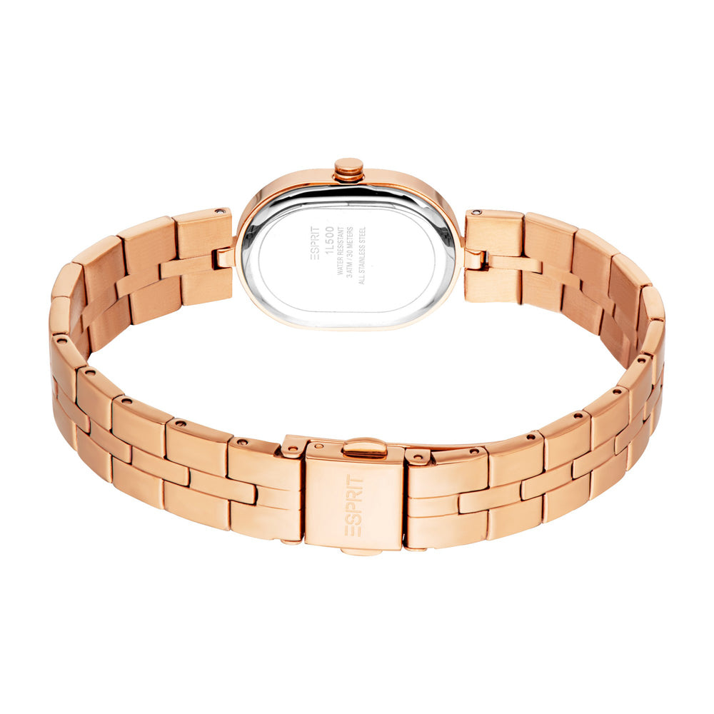 A fresh take on classic design, this Esprit timepiece pairs a warm rose gold bracelet with a sleek white oval dial, creating a modern statement of style.