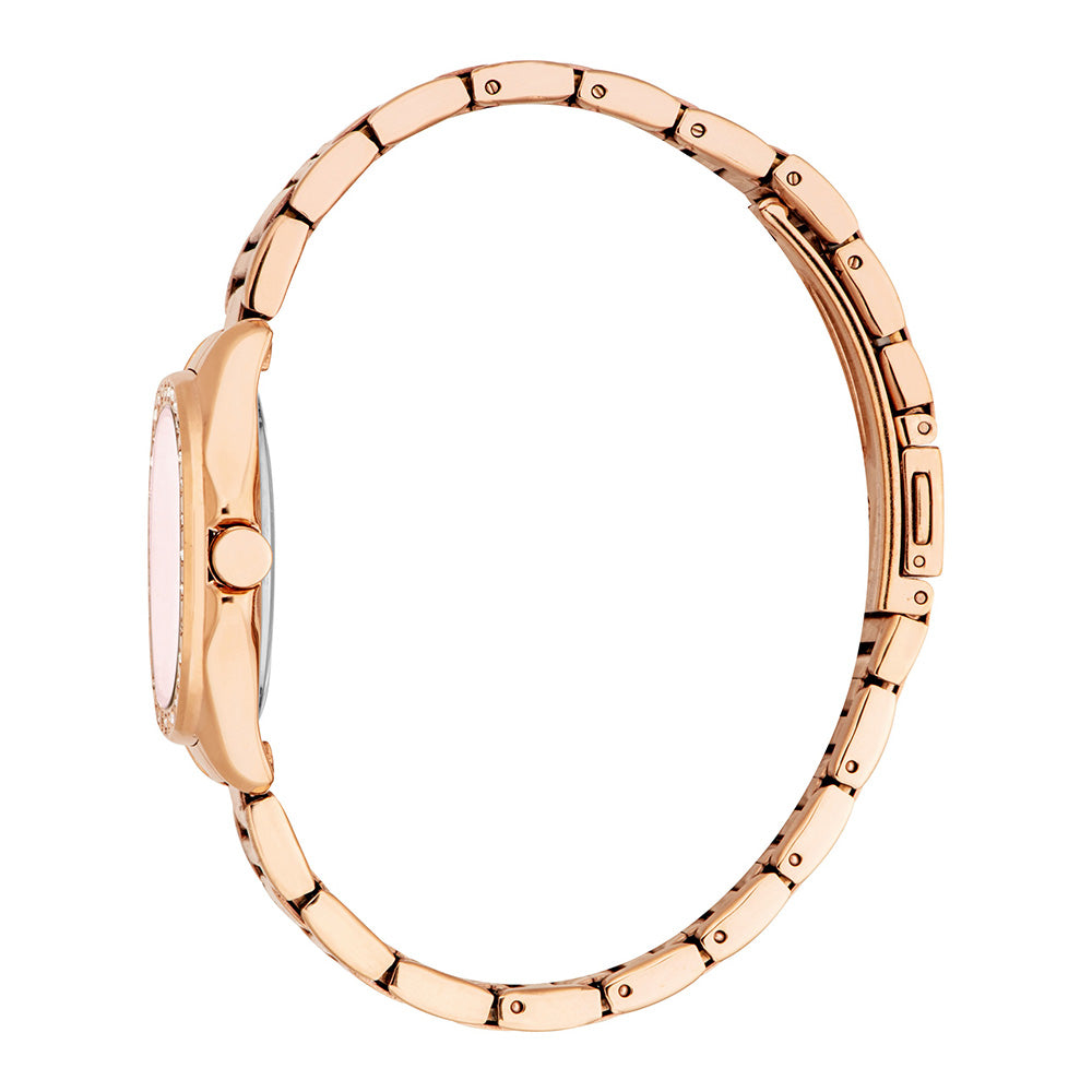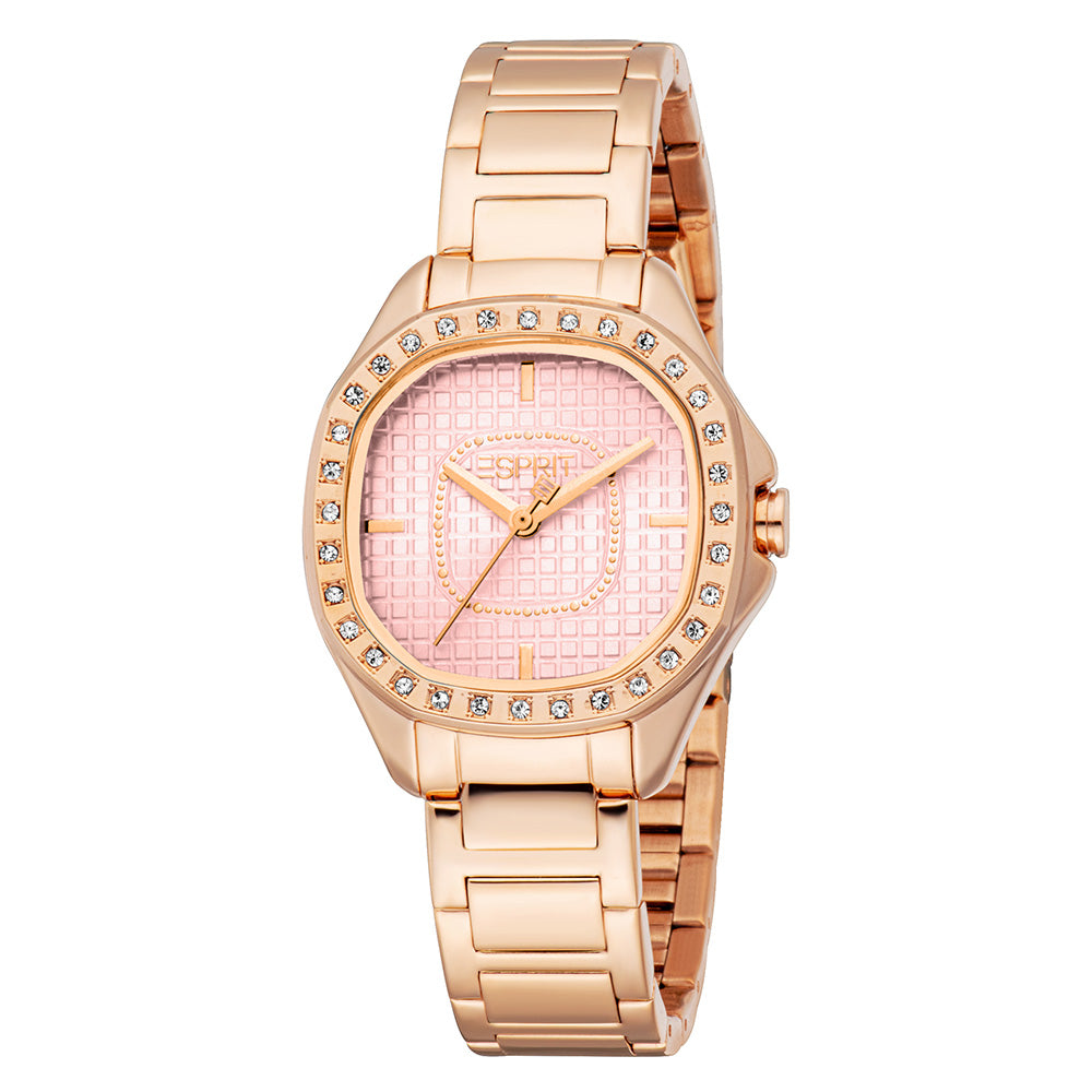 A perfect blend of fun and finesse. This rose gold watch boasts a soft pink grid-patterned dial, framed by a bezel of sparkling crystals, ensuring you dazzle from day to night.