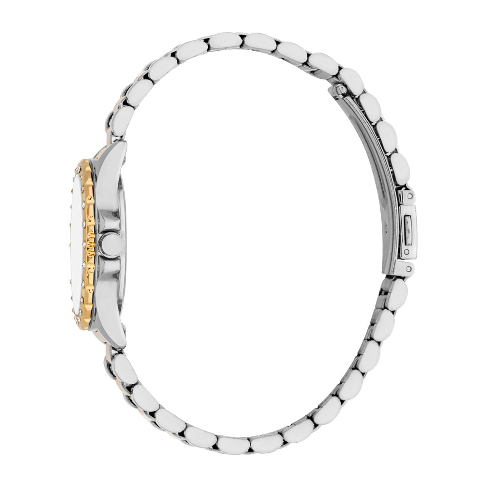 Captivating in design, the crystal-studded gold bezel encircles a luminous dial, complemented by a silver-and-gold bracelet for ultimate charm.