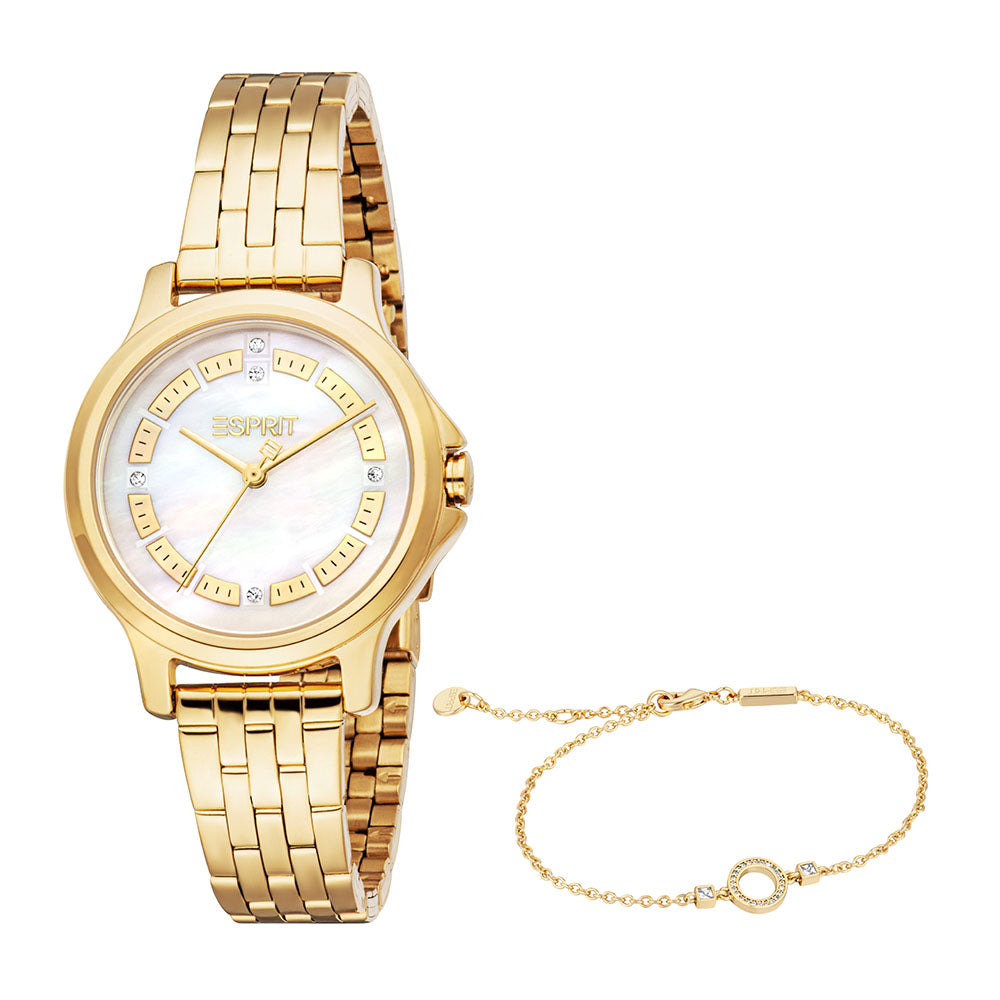 A golden glow that never fades. The polished gold-tone design, shimmering dial, and refined bracelet make this Esprit set the perfect statement of elegance.