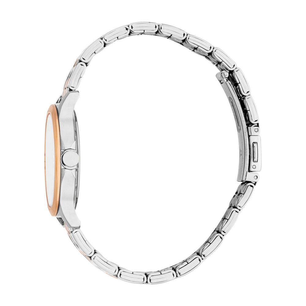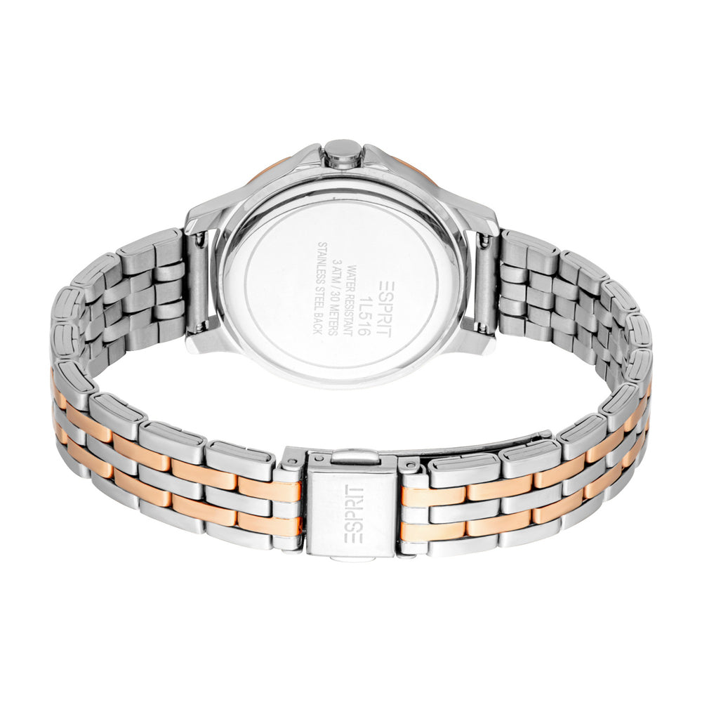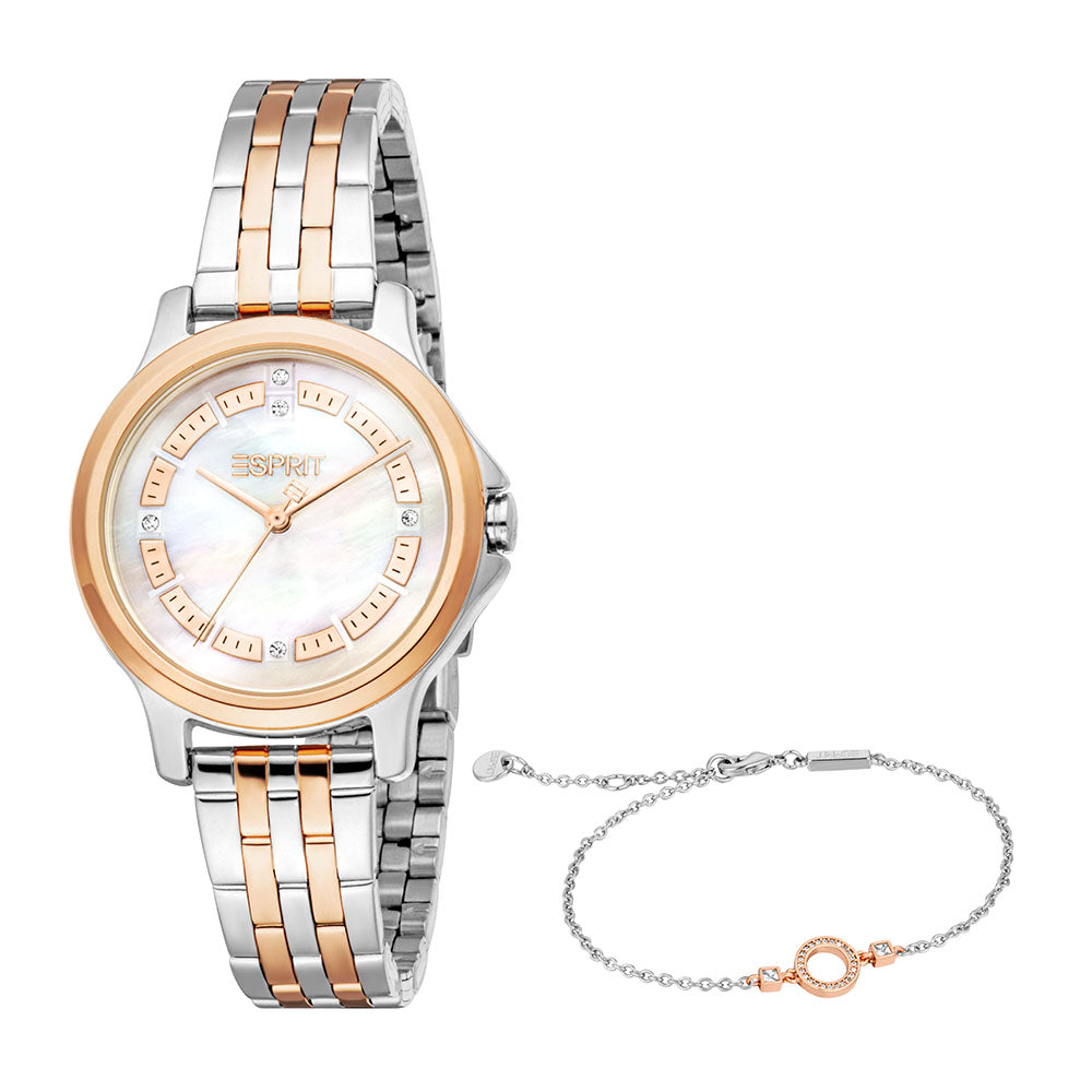 A whisper of rose, a shimmer of pearl. This Esprit watch and bracelet set blends soft rose gold with sleek silver, wrapped around a dreamy mother-of-pearl dial for a look that’s both graceful and striking.