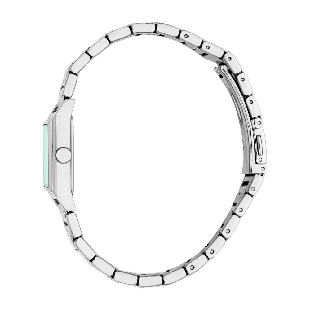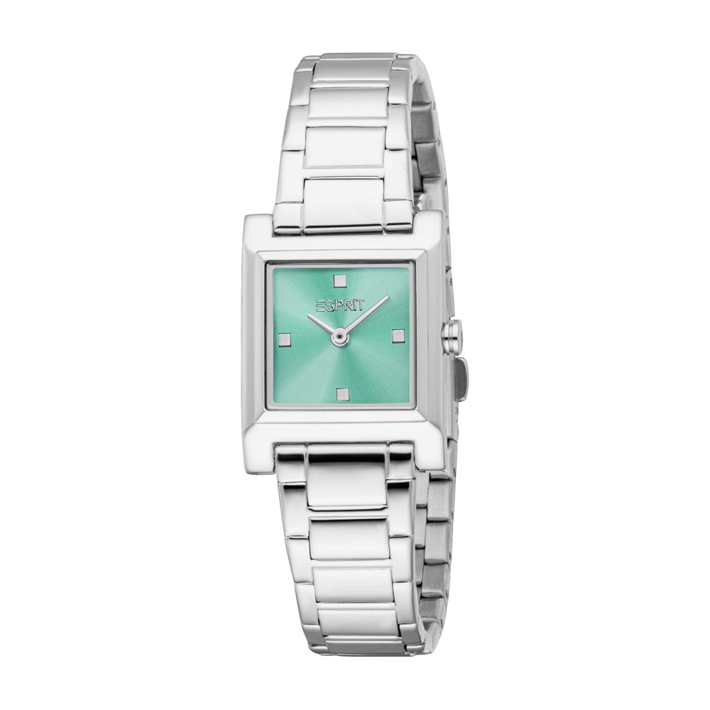 Minimalism meets elegance in this Esprit timepiece. The rectangular silver case frames a striking mint-green dial, making it a perfect blend of modern simplicity and bold style.