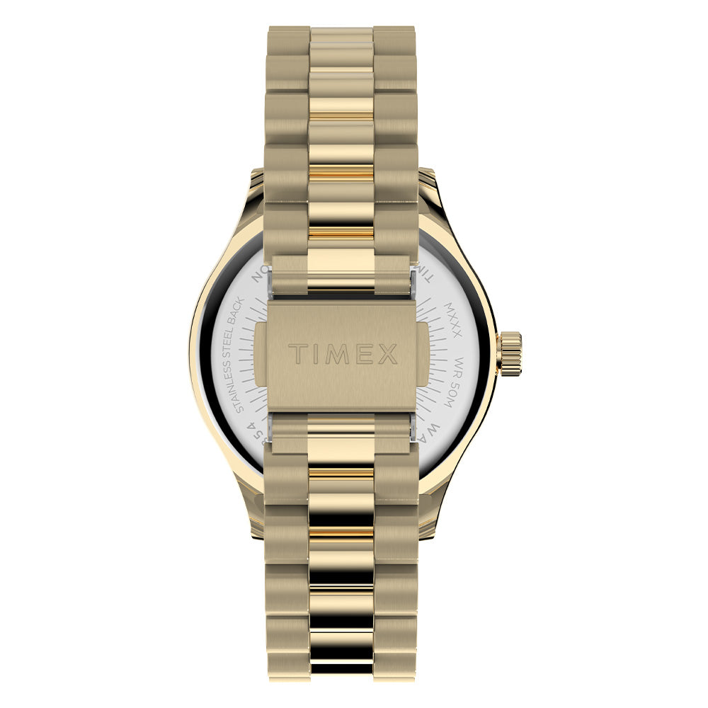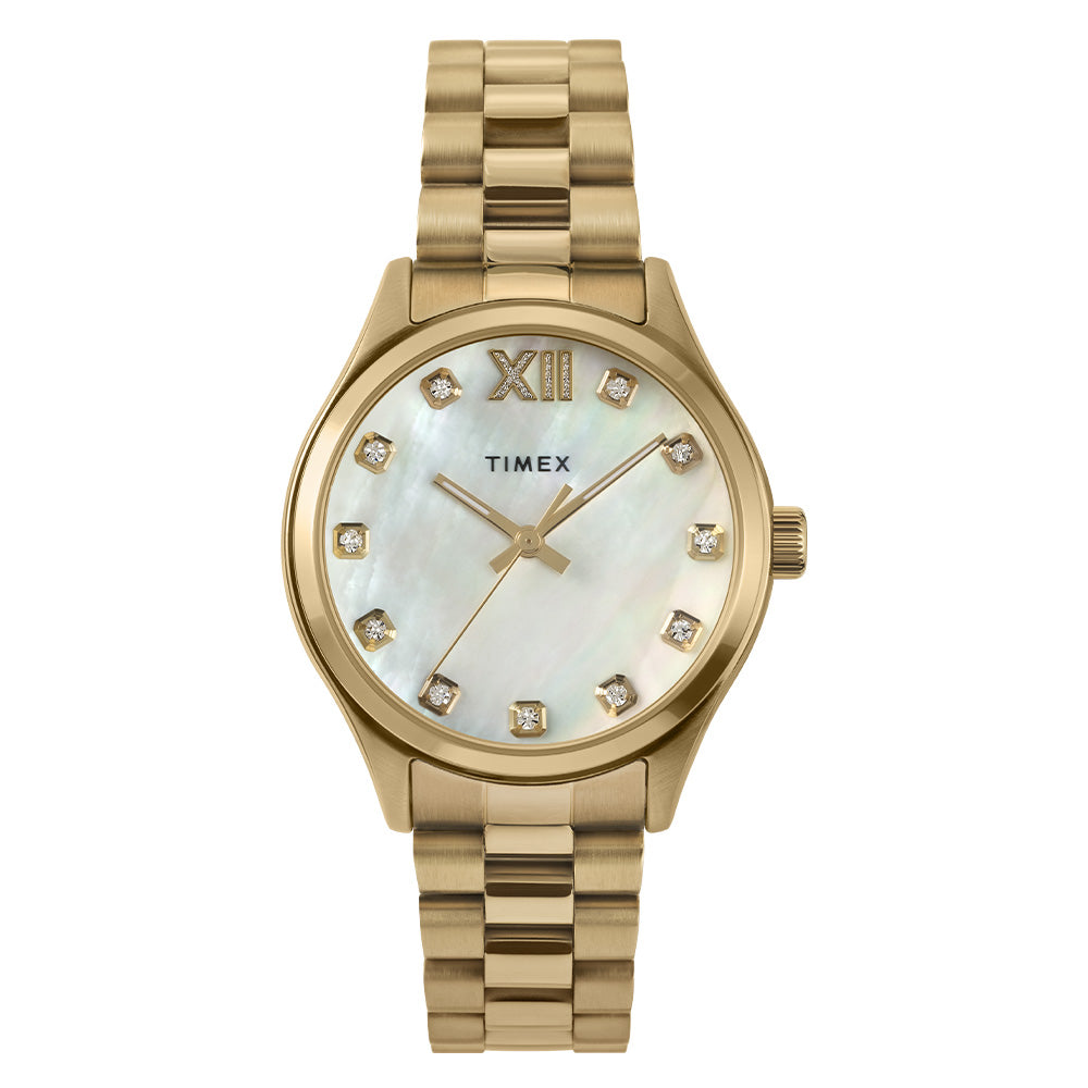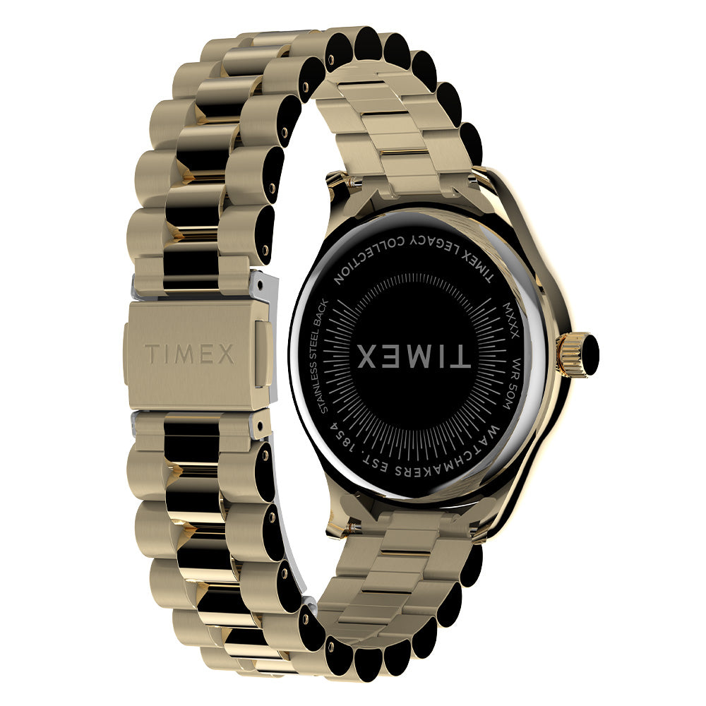 A fresh take on a traditional watch, the Timex Legacy never fails to find new ways of telling our story. This thoughtfully crafted timepiece features a gold-tone 34mm case and coordinating stainless-steel bracelet with a natural mother-of-pearl dial that shimmers with your every movement. A testament to our heritage and well-suited for everyday wear, the dial offers gorgeous crystal accents, luminant hands, and a glittering Roman numeral marker at 12 o’clock.