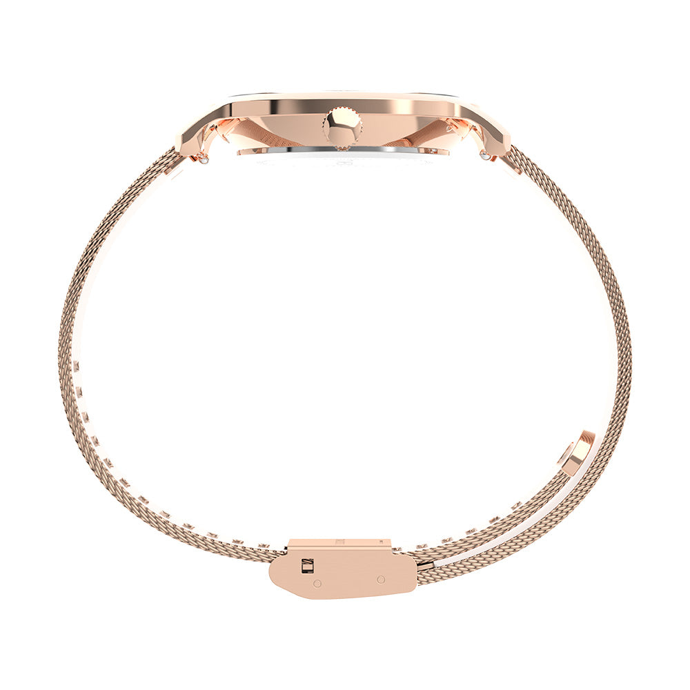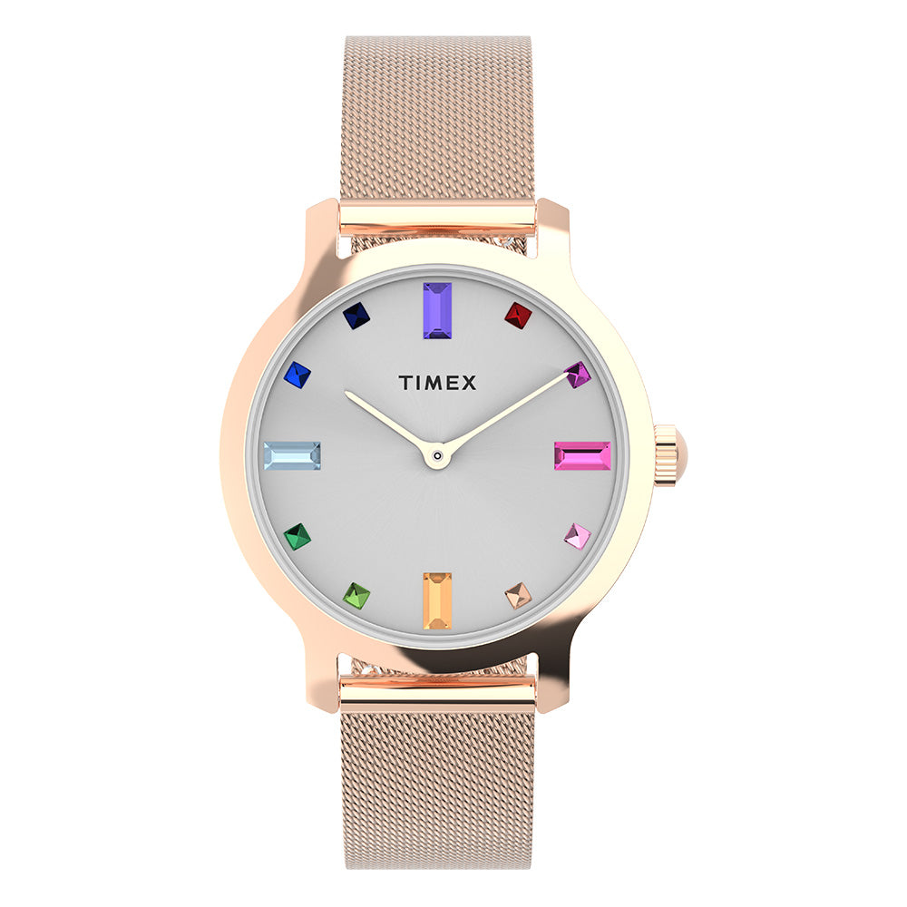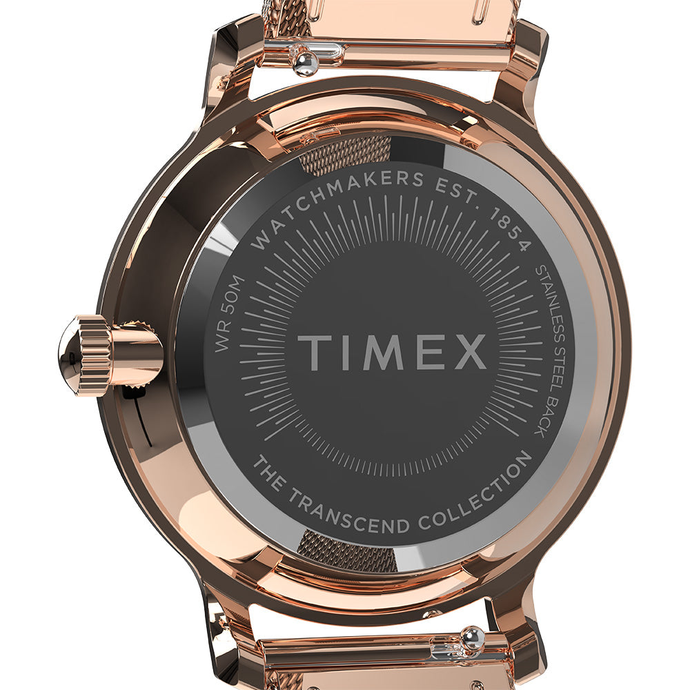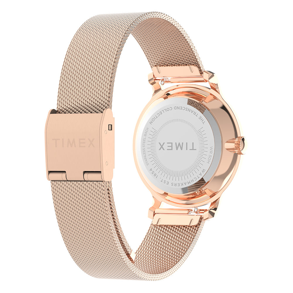 With an elegant sunray dial, a polished rose gold-tone case, and a rose gold-tone stainless-steel mesh band, our slim Transcend watch in a subtle 31mm case size offers a touch of sophistication to your look. Dimensional crystal markers in a rainbow of color attract just the right amount of attention to the silver-tone dial, giving you a well-rounded watch that otherwise speaks to understated style and class.