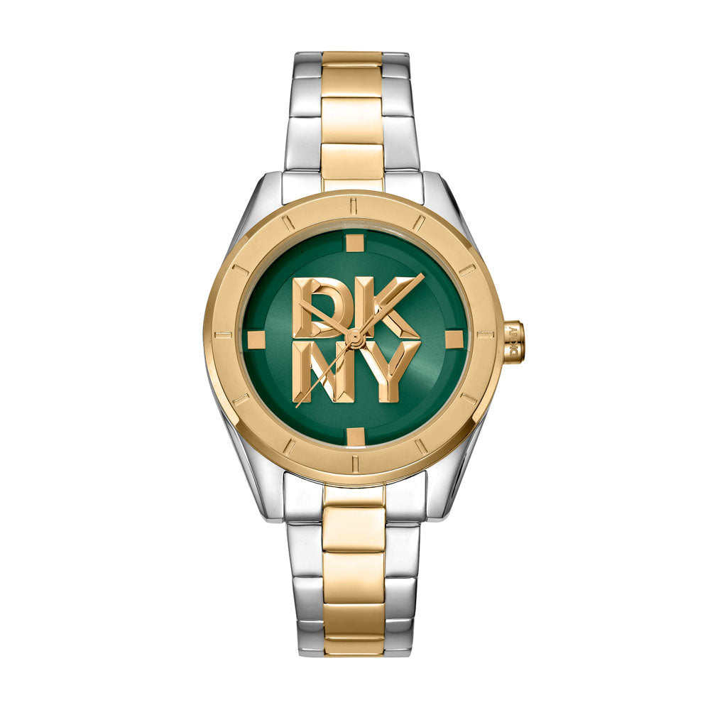 At the heart of the dial, the large DKNY logo in gold relief creates a striking focal point, perfectly balancing the clean, minimalist design. The subtle incision on the bezel adds an element of dynamism, while maintaining an air of sophistication and equilibrium.