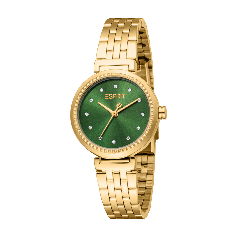 A unique fusion of nature and luxury, this Esprit watch exudes sophistication. The emerald-green dial, adorned with crystal markers, is perfectly complemented by the radiant gold bracelet.
