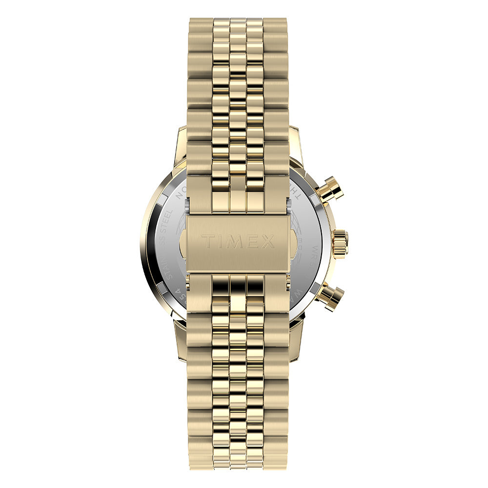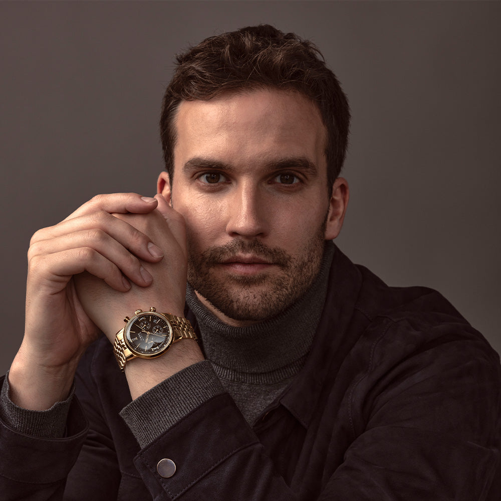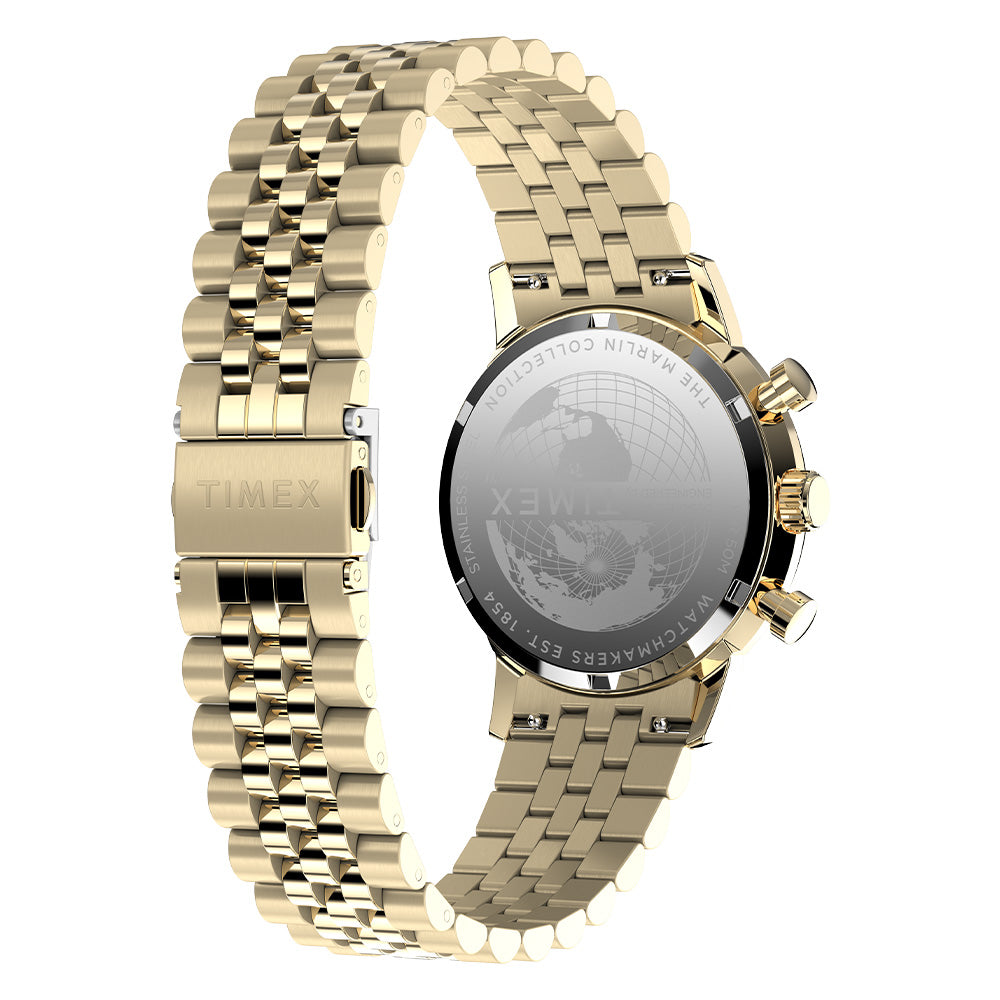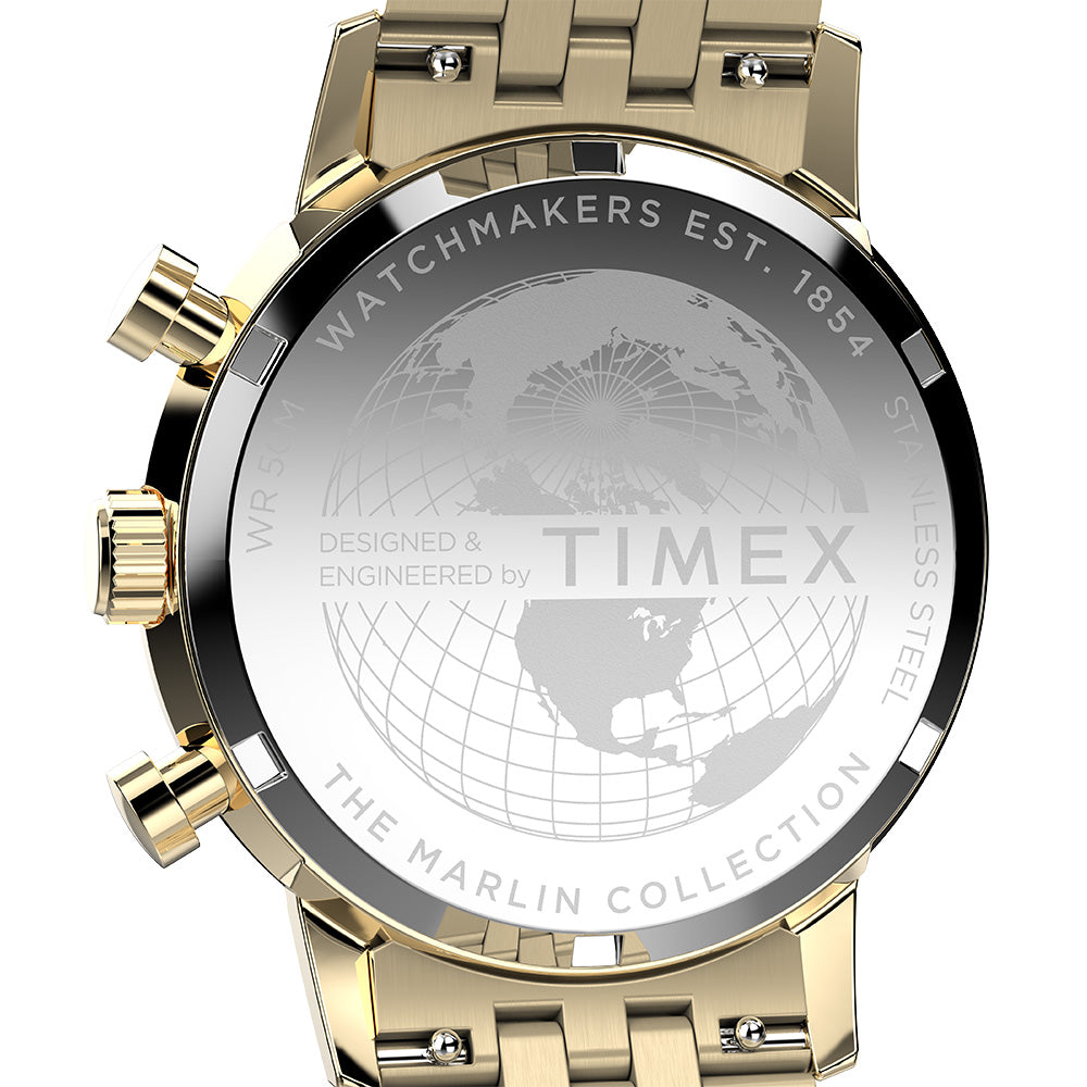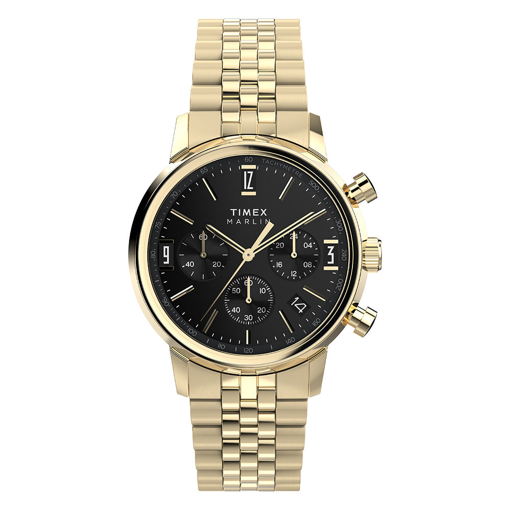 Our Marlin Quartz Chronograph Tachymeter was the first chronograph to join our Marlin line, as well as the first Marlin powered by a quartz movement. Beautifully detailed, it features a tachymeter index along its outer minute track to measure speed, as well as a unique date window placement and gorgeous gold-tone accents on its black dial. Paired with a recycled stainless-steel bracelet with quick-release spring bars. Though its build broke new ground in our watchmaking heritage, this timepiece retains the classic Marlin features with a sturdy 40mm recycled stainless-steel case, domed acrylic crystal, and retro-style applied indices at 3, 9, and 12 o'clock.