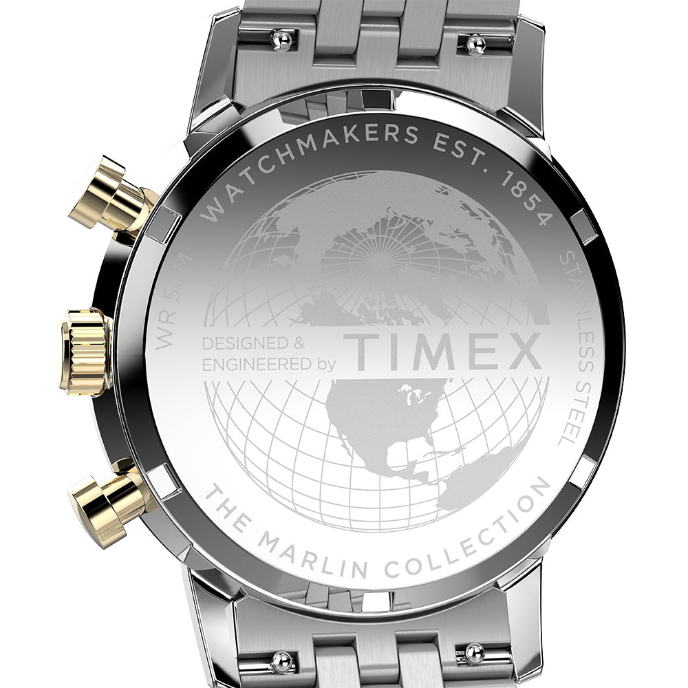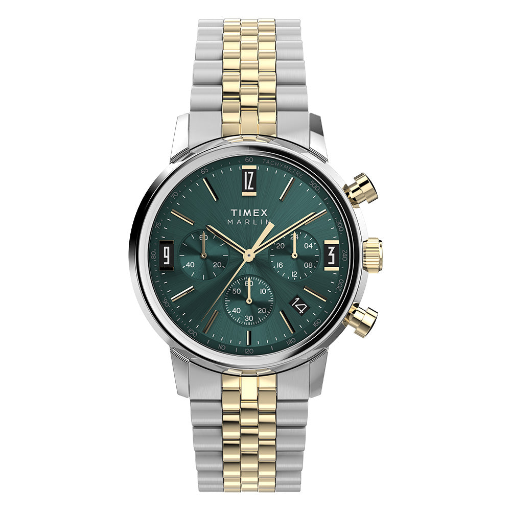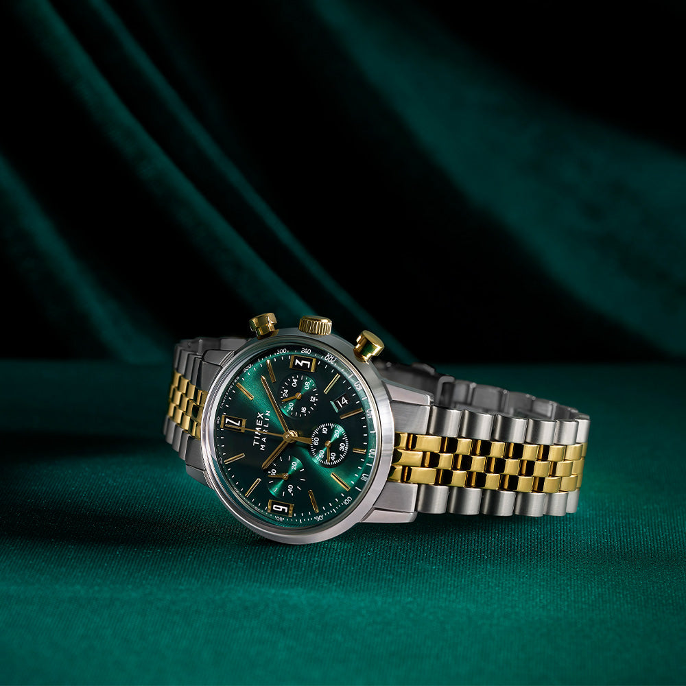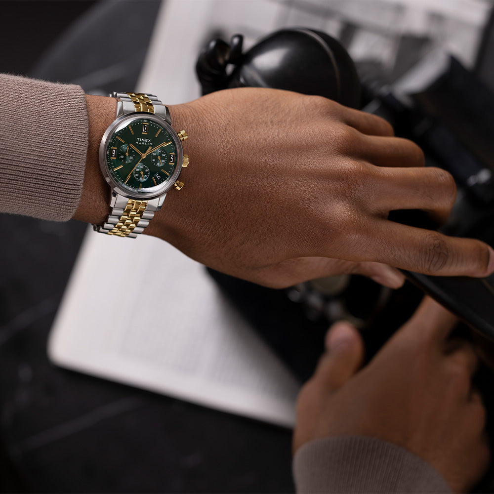 Our Marlin Quartz Chronograph Tachymeter was the first chronograph to join our Marlin line, as well as the first Marlin powered by a quartz movement. Beautifully detailed, it features a tachymeter index along its outer minute track to measure speed, as well as a unique date window placement and gorgeous gold-tone accents on its green dial. Paired with a recycled stainless-steel bracelet with quick-release spring bars. Though its build broke new ground in our watchmaking heritage, this timepiece retains the classic Marlin features with a sturdy 40mm recycled stainless-steel case, domed acrylic crystal, and retro-style applied indices at 3, 9, and 12 o'clock.